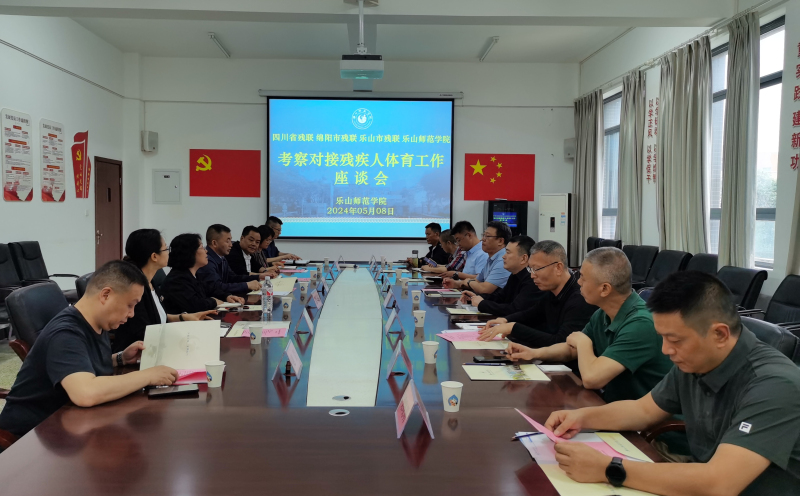 本网讯(文图/杨燕)5月8日,四川省残联宣文处副处长樊轶、绵阳市残联副理事长简文峰、乐山市残联副理事长周仲林,以及绵阳市江油市残联、教体局的领导和工作人员等一行12人来校对接残疾人体育工作。对接工作座谈会在特教大楼A栋408会议室举行,学校特殊教育学院、康复学院、体育学院有关领导参加了座谈。座谈会由特殊教育学院、康复学院院长张梅主持。