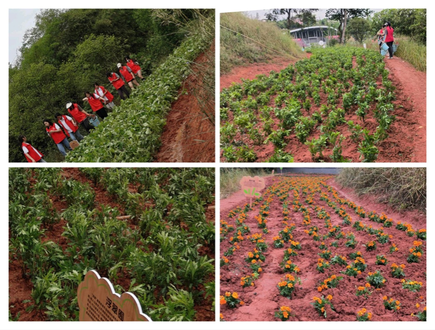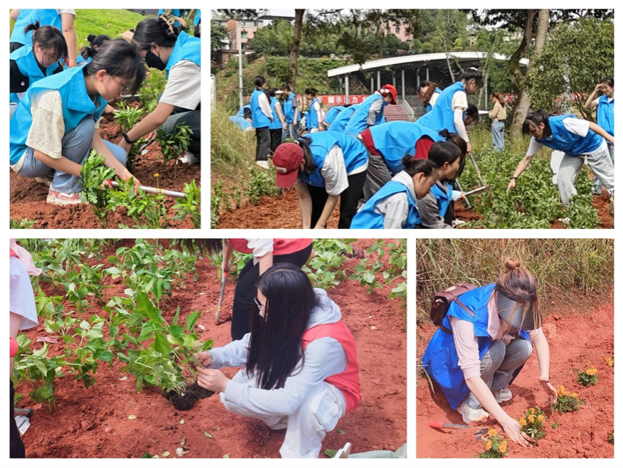 在现场,同学们分工合作,默契十足。有的同学拿着锄头用力地挖掘着适合花株生长的凹坑;有的同学将准备好的花株插入凹坑内;有的同学小心地调整着花株的姿势,确保根系平稳地放置在凹坑中;还有的同学填充栽培土壤,将土壤填充到凹坑中,轻轻拍实,确保土壤与花株的根系紧密接触。劳作场地呈现一派热火朝天又井然有序的景象。大家在忙碌的劳作中,不仅体验到了种植的乐趣,也深刻感受到了团队合作的力量和重要性,充满了积极向上的氛围。