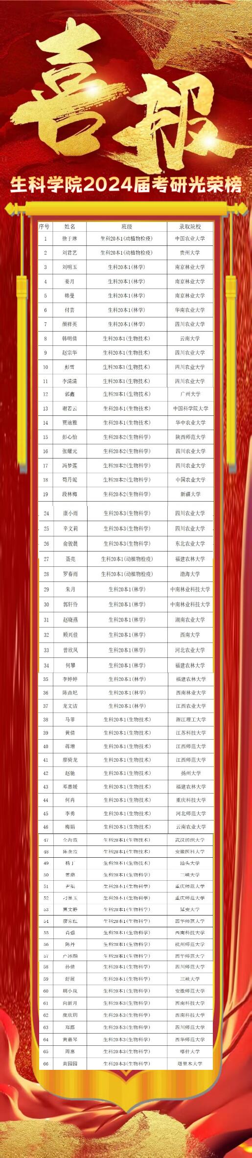 学院2024届毕业生共283人,报考研究生176人,报考率62.19%,上国家线81人,上线率46.02%。截止目前,考研拟录取66人,录取率28.95%,其中林学专业升学率48.3%,生物技术专业升学率43.2%。26人考入武汉大学、中国农业大学、四川农业大学、中国科学院大学、陕西师范大学等双一流院校。