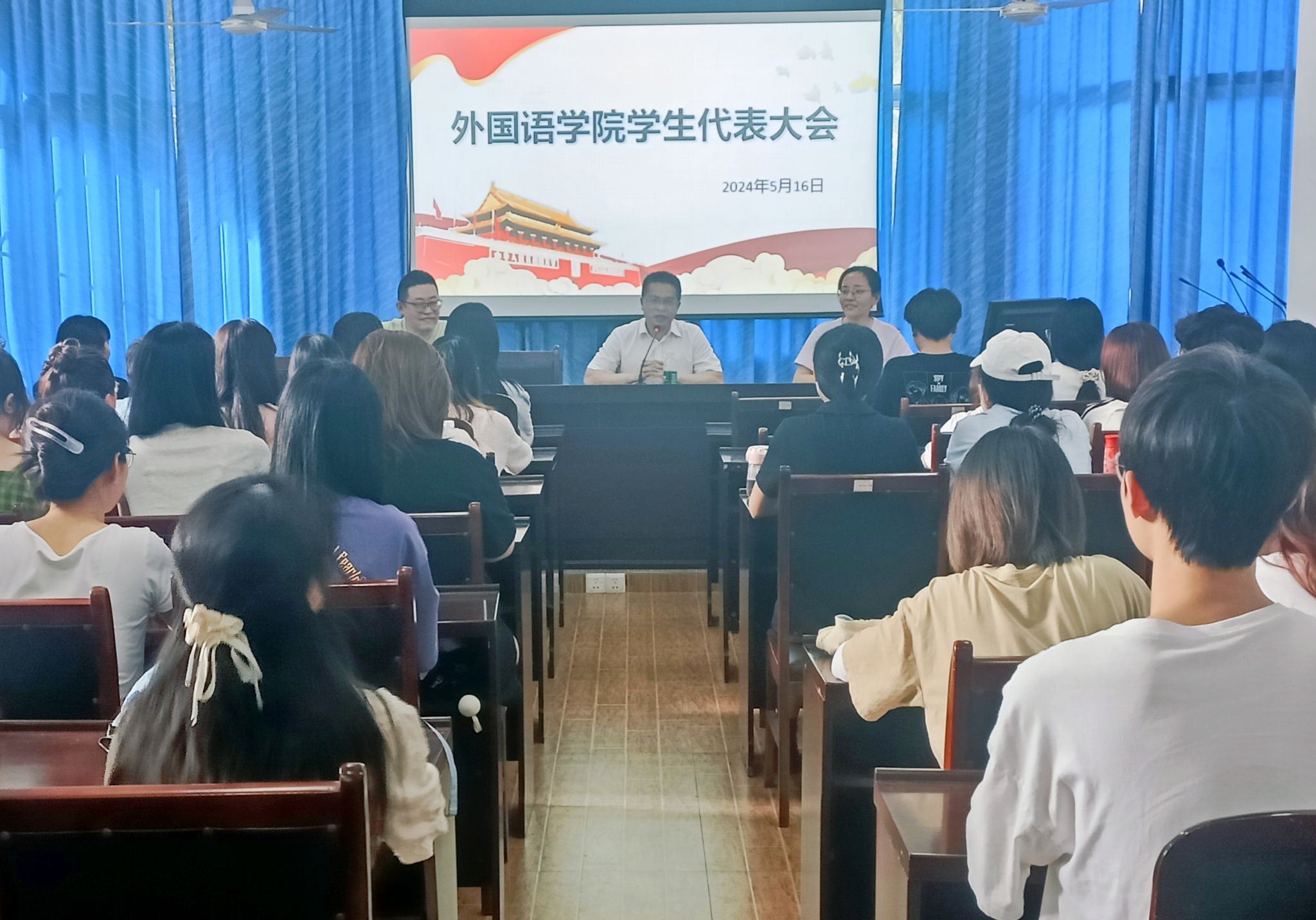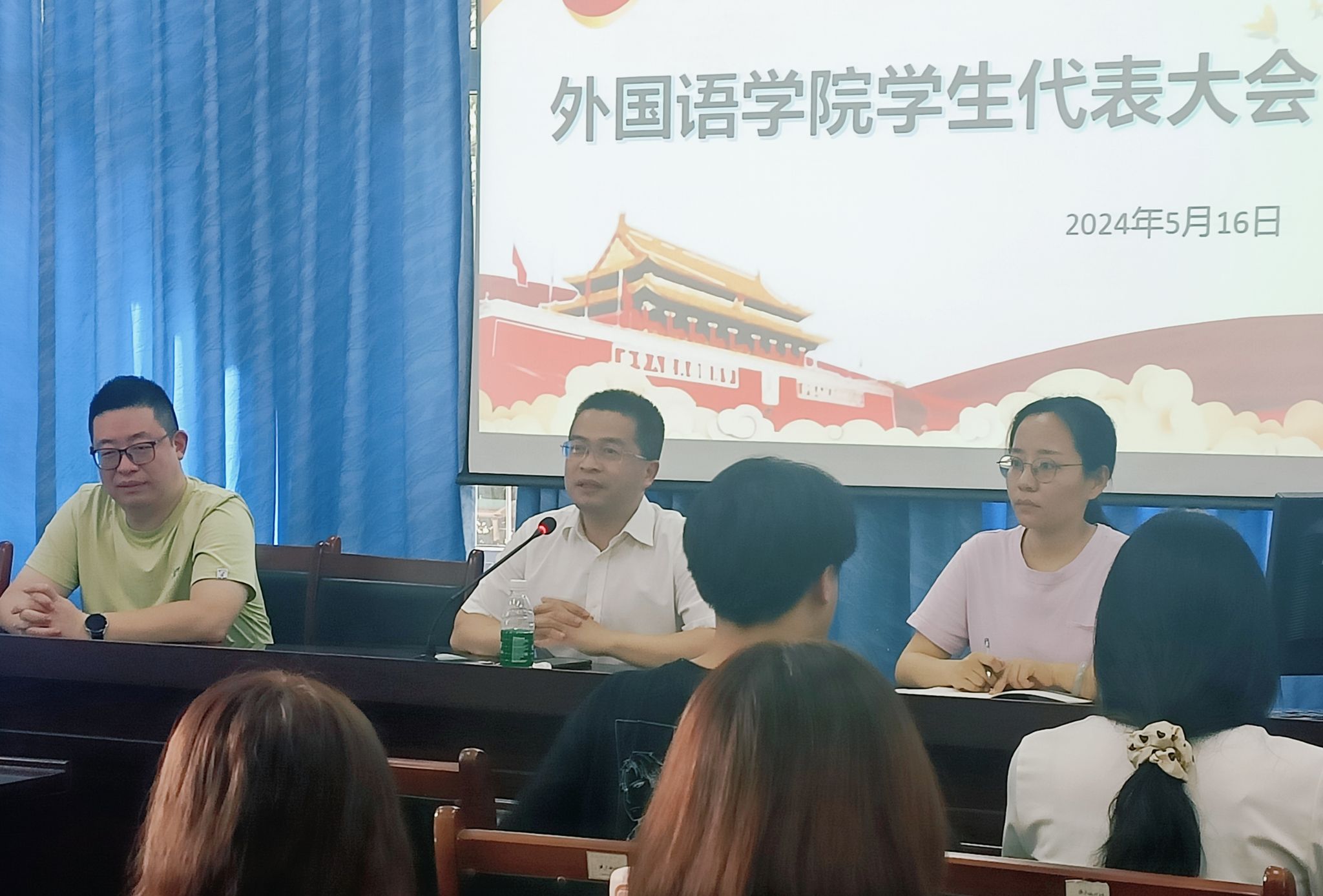 大会开始,袁明锋肯定了过去一年学生干部们的辛勤付出和取得的成绩,感谢了曾云超对外国语学生工作的辛勤付出,向学生干部介绍了外国语学院新任分团委副书记曹琳,宣布学院主要学生机构各项内容由曹琳负责接管。对未来学院发展提出了殷切的期望和要求,要求学生干部做到以下几点:一是做有眼界、有大局观和有担当的学生干部,在不断的学习中积累眼界,在不断的实践中摸索大局观,在初心的升华中体现担当。二是兼顾好专业学习和学生工作,科学合理安排时间,在讲求效益上下功夫,提高学习和工作效率,利用好碎片化时间。三是去除官僚化作风,全心全意服务同学。做到从同学中来、到同学中去,认真倾听广大同学的诉求,积极帮助同学解决困难。