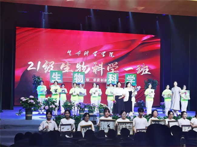 21级生科1班是一个由50人组成的班级,自入学以来便以优异的成绩和全面的综合素质,稳居年级前列。他们不仅在学业上表现出色,平均学分绩点名列专业前茅,更在班级建设、社会实践和志愿服务等方面展现了极高的综合素质。班级成员始终秉持“业精于勤荒于嬉”的学习态度,坚持“吾生也有涯,而知也无涯”的求知精神,将“一物不知,深以为耻”的求知精神融入日常学习生活中。在评选活动前期,班级同学齐心协力,精心准备申报材料、视频展示和现场主持稿,经过多次打磨和修改,最终呈现出高质量的申报作品。在班级学风建设方面,他们展现了极高的自律性和团队合作精神,课堂出勤率高、纪律严明,得到了评委的认可和好评。在现场展示环节,21级生科1班结合班级特色和学科特点,通过原创情景剧《鸢尾花》生动展现了生物科学的魅力,以及作为师范专业学生的专业素养和风采。该剧讲述了在老师的指导下,一名学生对生物学科的认识发生转变,最终选择成为一名生物教师的故事,情节感人至深,赢得了现场观众的阵阵掌声。经过激烈的角逐和综合考评,生科1班最终凭借出色的表现和卓越的成绩,成功获得先进班集体评选活动第一名,并荣获“先进班集体”和“优良学风班”两项荣誉称号。