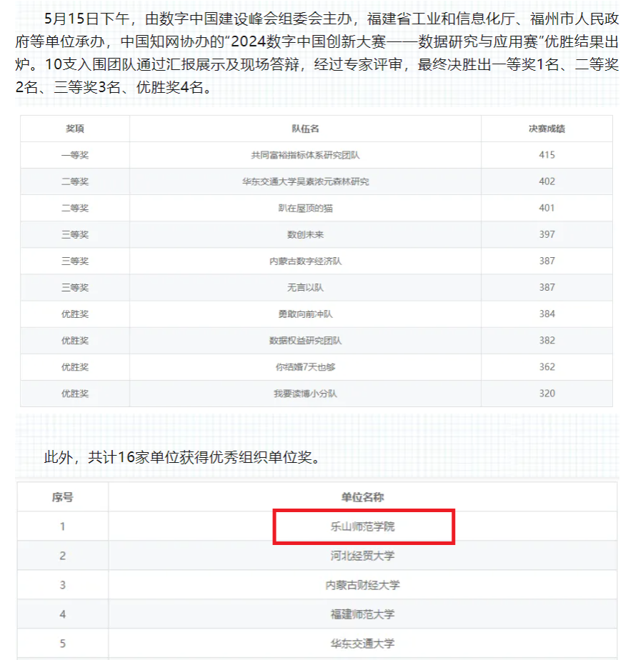 本网讯(文图/朱姝姗)近日,由数字中国建设峰会组委会主办,福建省工业和信息化厅、福州市人民政府等单位承办,中国知网协办的“2024数字中国创新大赛——数据研究与应用赛”比赛结果出炉。在国内外210多高等院校及260家企事业单位参与情况下,我校图书馆在接到活动通知后积极组织学科馆员宣传,对接相关学院领导,保证相关专业学生的参与数量与质量,经过大家共同的努力,在此次比赛中我校图书馆荣获“优秀组织单位奖”。