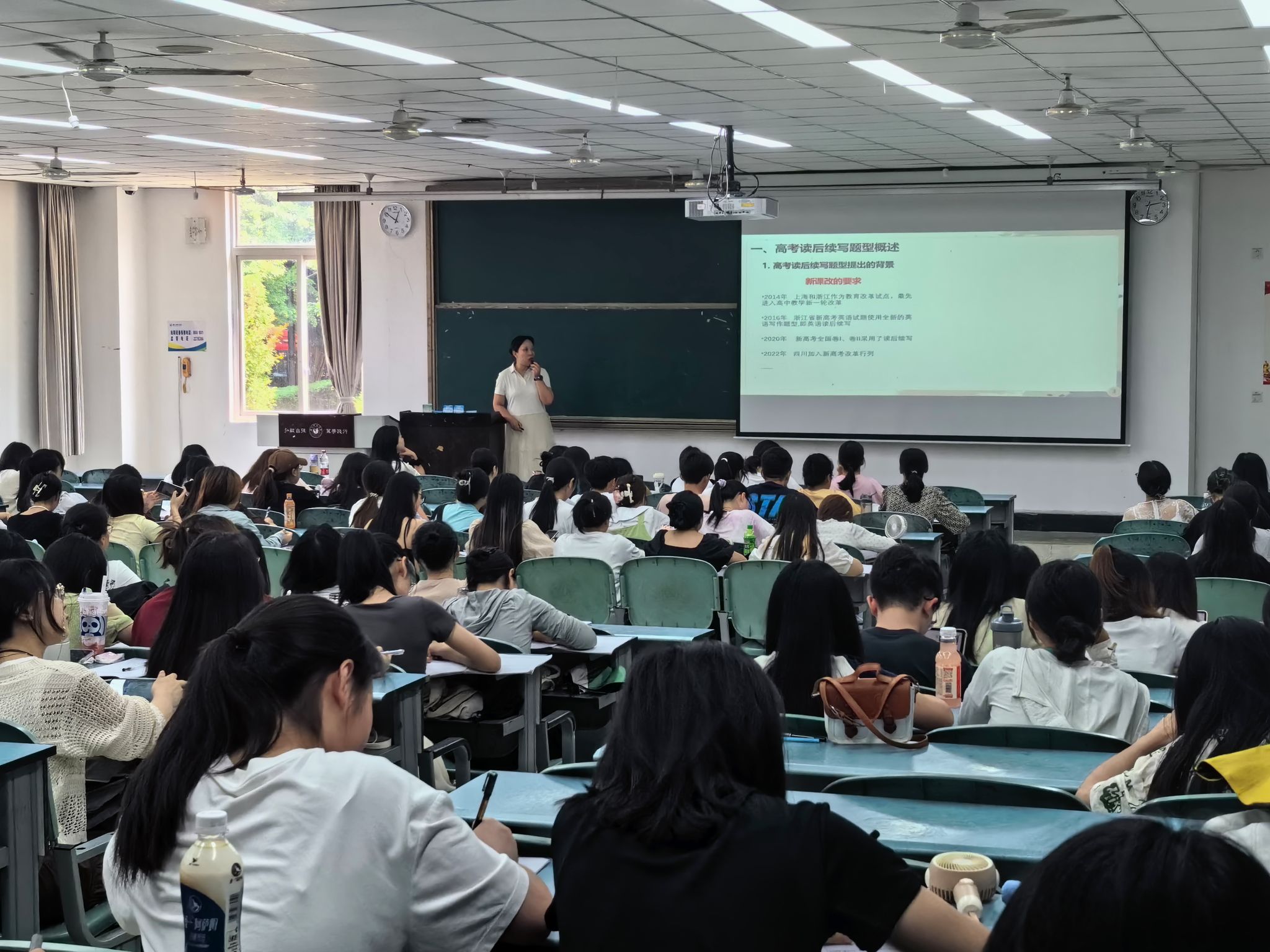 本网讯(文图/廖百秋)5月20日下午,乐山一中英语教研组长肖雪、2025届英语备课组组长陈彦遐受邀在行知楼101教室为2021级英语专业学生做了题为“高考英语新题型‘读后续写’教学及命题策略探究”的专题讲座。讲座由英语专业专任教师廖百秋博士主持。