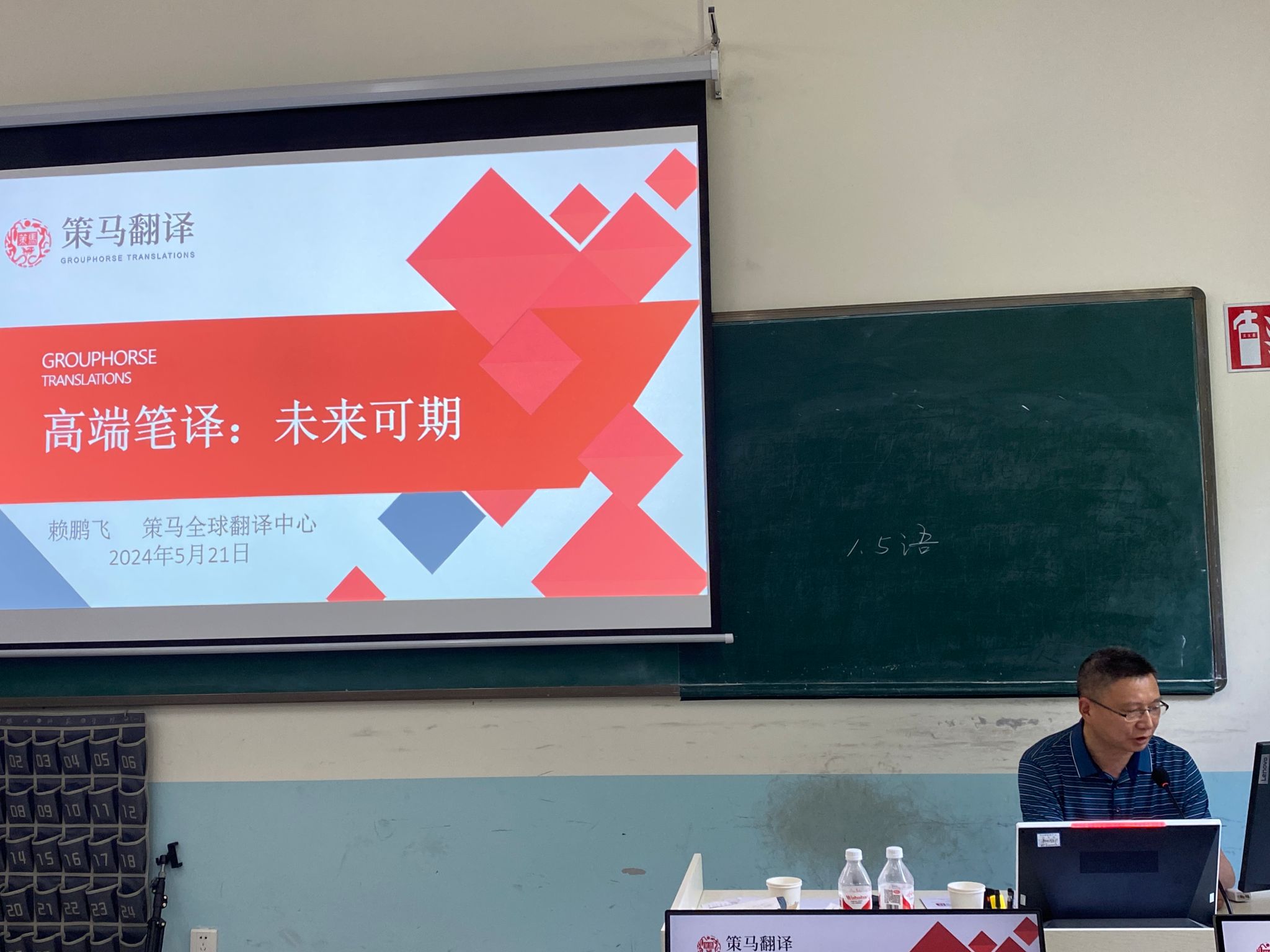 随后,策马全球翻译中心笔译部副总监兼国际组织文件翻译组副组长,策马国际货币基金组织(IMF)翻译项目总负责人、策马中华笔译大赛命题人和点评人赖鹏飞以“高端笔译:未来可期”为题开展笔译实务讲座。赖鹏飞总监以笔译行业市场现状及发展趋势引入正题,向同学们介绍了翻译行业产值继续保持增长的趋势。其中,中译外、外译中仍为主要经营业务,英德法翻译业务占比较高。随后,赖鹏飞总监对策马笔译服务进行了系统性介绍,重点介绍了其具有跨时区服务、联合国等顶尖机构官方翻译服务供应商、多语言以及业内最大规模口译和笔译人才库的特点。
