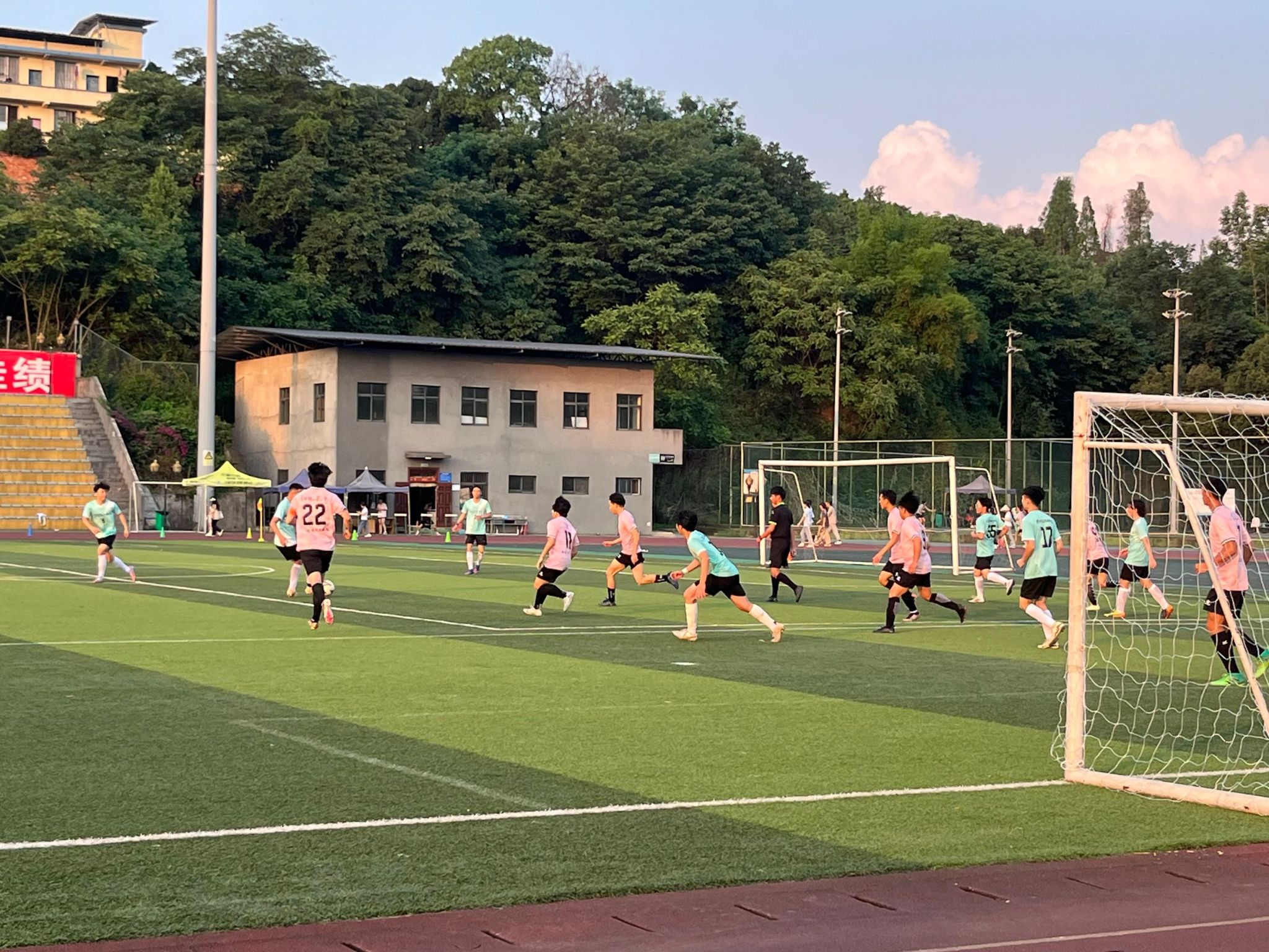 本网讯(文图/刘桐江)5月22日,乐山师范学院第三届进取杯暨第三届迎新杯八人制足球赛决赛在美丽的晚霞中落下帷幕,美术与设计学院凭借出色的团队配合和精湛的个人技艺,最终通过点球大战战胜马克思主义学院获得冠军,创造了学院的最佳战绩。本场比赛,美术与设计学院院长熊火花,党委副书记赵元,学生科科长崔玉,年级辅导员刘桐江、任自林、吴嘉川亲临现场为同学们加油助威。