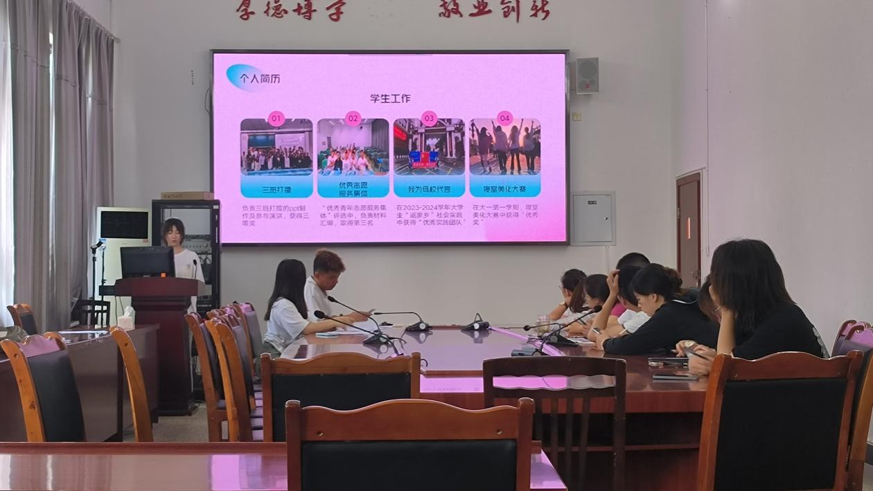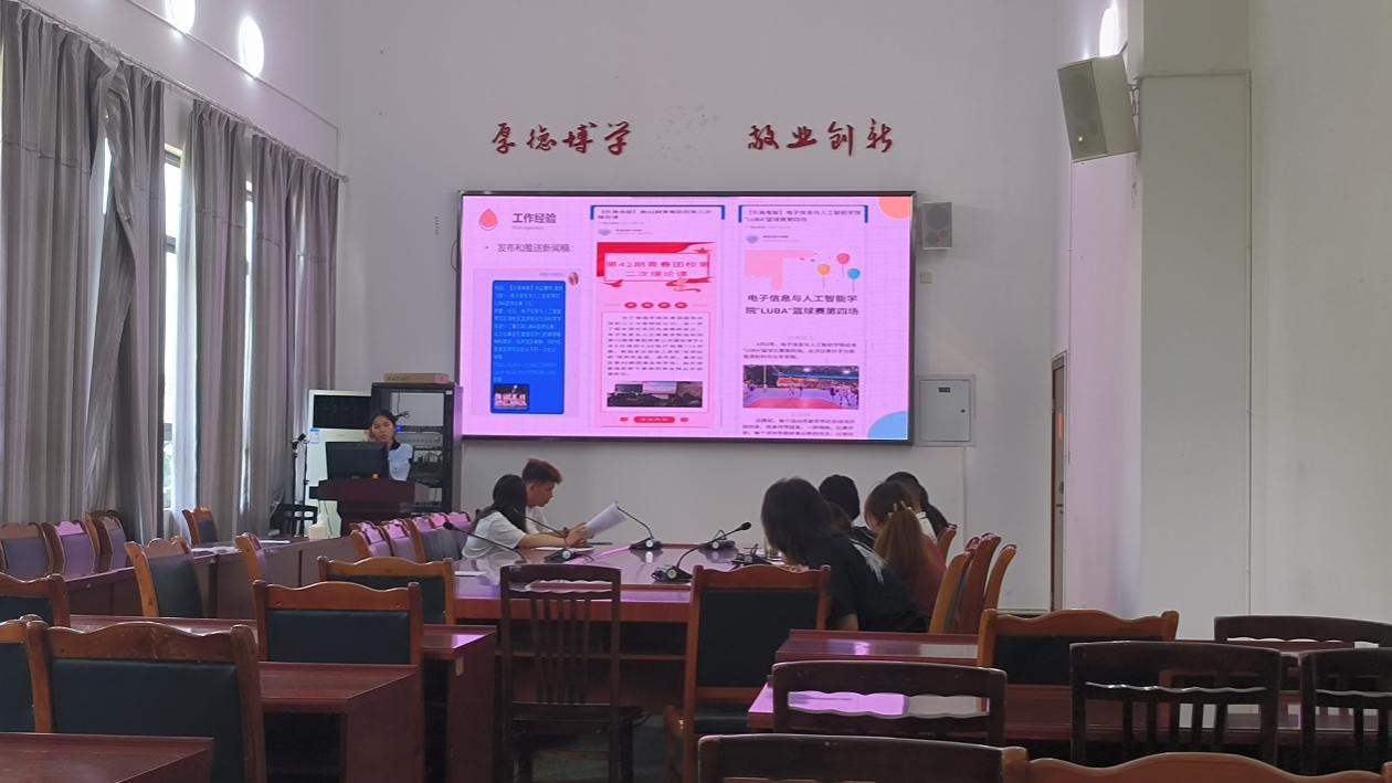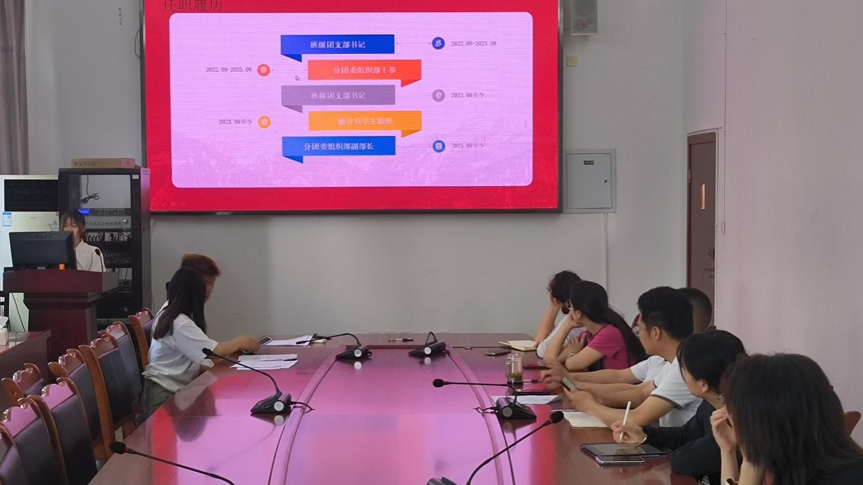 本网讯(文图/陈江)为进一步加强电子信息与人工智能学院学生组织建设,遴选一批政治坚定、作风过硬、素质全面的学生干部,保证学院学生工作更加有效开展,5月22日,电子信息与人工智能学院在特教C501开展主席团成员换届遴选会。分团委书记强光平,辅导员雷雄锴、肖苗、狄红霞担任评委,2023-2024学年主席团部分成员参加此次换届遴选会。
