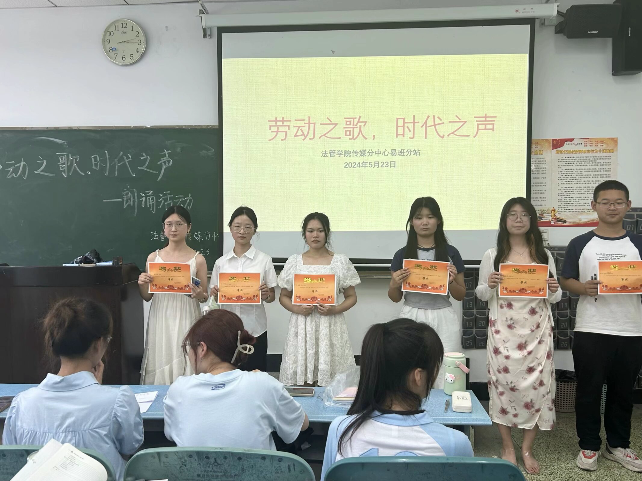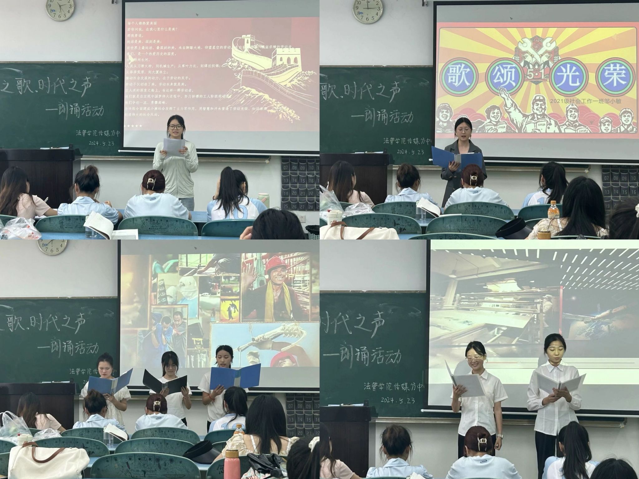 本网讯(文/江琳、杨龙 图/熊慧芸)为弘扬并发展劳动文化,传承昂扬向上、踏实能干的劳动精神,5月23日下午,法学与公共管理学院分传媒中心在行知楼115教室开展“劳动之歌,时代之声”劳动文化朗诵比赛。本次比赛共有9支队伍参赛。