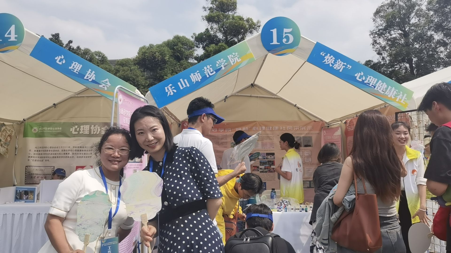 尽管当天天气炎热,但我校展位的人气依然旺盛。许多外校师生被社团颇具创意的“水墨缤纷,晕染静心”非遗漆扇制作互动游戏所吸引,纷纷加入进来。其中,现任宜宾职业技术学院心理健康教育中心主任李德琴老师,作为我校心理社的第一届会长,她在现场对心理社的发展,感到无限的感动与期许。心理社在现场,通过分发活动设计手册、展示品牌活动宣传海报、进行互动游戏、讲解员讲解等方式,为大学生提供心理健康方面的知识和支持,帮助他们更好的应对心理困扰,提升心理素质。