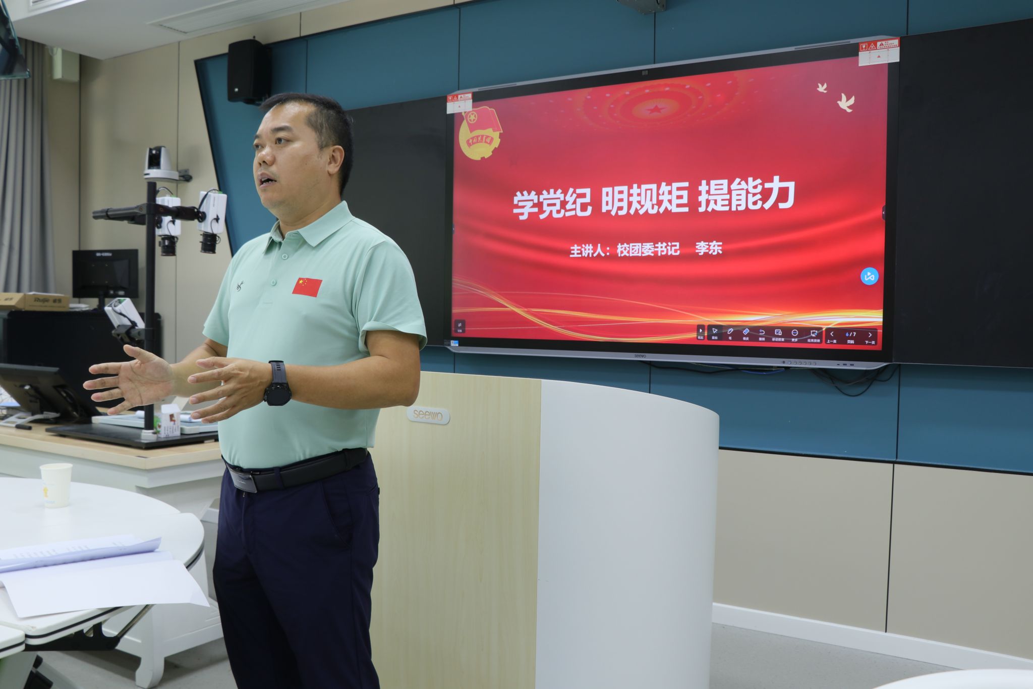 团委书记李东结合学校机关党委开展党纪学习教育的工作方案,现场为15名团干部们进行了主题为“学党纪、明规矩、提能力”的党纪业务培训。在培训会最后的总结发言中,他指出,团干部们要坚定不移跟党走,务必秉承“党旗所指,团旗所向。党有号召,团有行动”的思想作风。他要求全体团干部们将培训会的内容认真学习领悟,并将其应用到日常团学工作中去。此外,李东还就近期学校共青团重点工作进行了相应解读与部署。