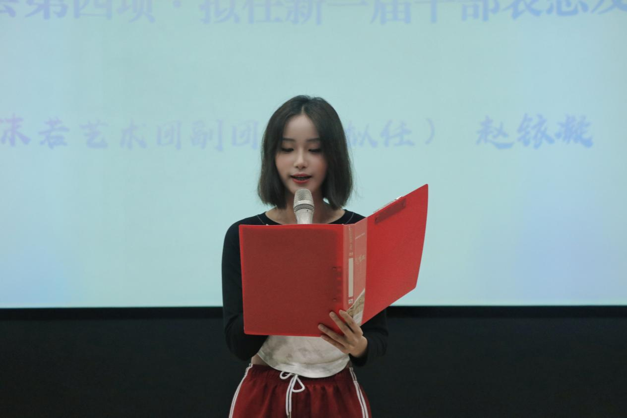 会上,团长房靖翔宣读了新一任干部的名单,各部门干部分别上台做了自我介绍。学生干部代表赵铱凝代表新一届学生干部作表态发言,她向一直以来关心艺术团发展的领导老师还有学长们表示了崇高的敬意和诚挚的感谢,并代表新一届学生干部作出承诺,将积极履行职责,加强干部队伍合作和沟通,完善学生干部考核机制、注重创新提高,共同为沫若艺术团的繁荣发展贡献力量。