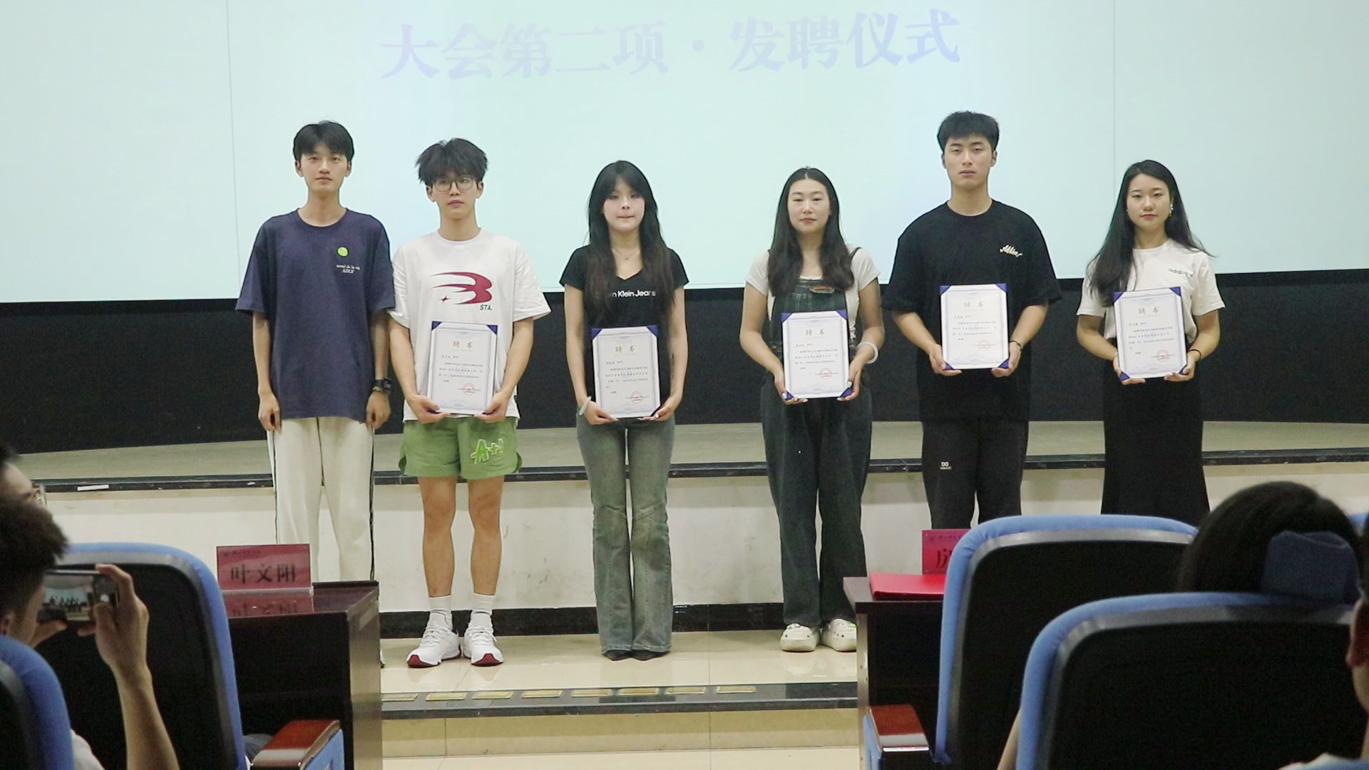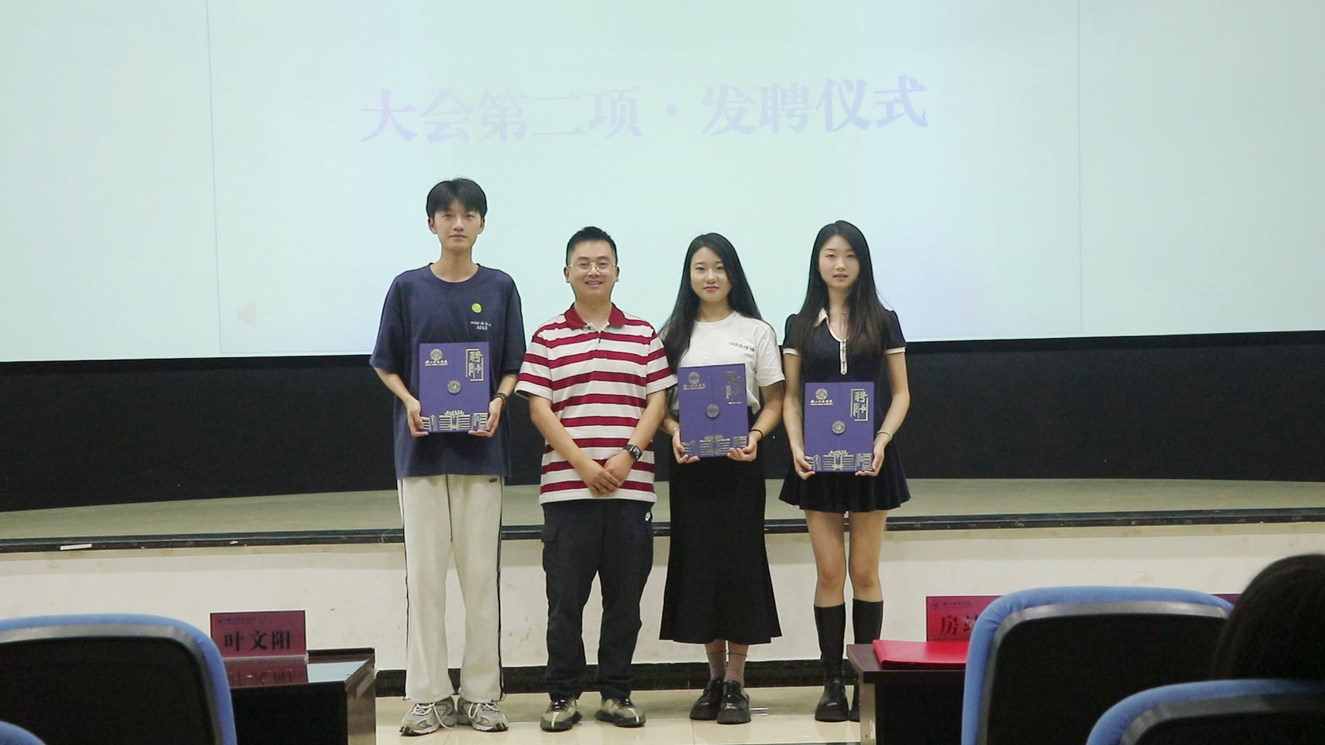 首先,艺术团团长房靖翔发表了换届致辞,对过去一年艺术团的工作进行总结,也就艺术团未来发展作出展望,激励新一届学生干部团结广大团员为艺术团发展作出更大贡献。随后,举行上一届干部发聘仪式,艺术团指导老师叶文阳,团长房靖翔和副团长李格、韦雨馥分别为上任主席团和各部门学生干部颁发了聘书,感谢同学们为艺术团的发展所做的贡献。