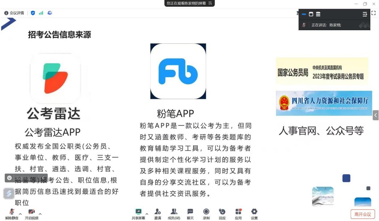 本网讯(文图/李佳媛)为促进学院学生就业指导工作,帮助学生合理备考,解决在考公过程中遇到的困惑,经济管理学院于5月25日开展了考公经验线上分享会。本次分享会由21级辅导员王东健主持,21级有意向考公的同学们参加了分享会,同时邀请了两位19级考公上岸优秀学生代表进行分享,他们分别是19级经济与金融班尹鑫晨,目前就职于国家统计局阆中调查队,19级会计一班陈家栩,目前就职于国家税务总局攀枝花市仁和区税务局。