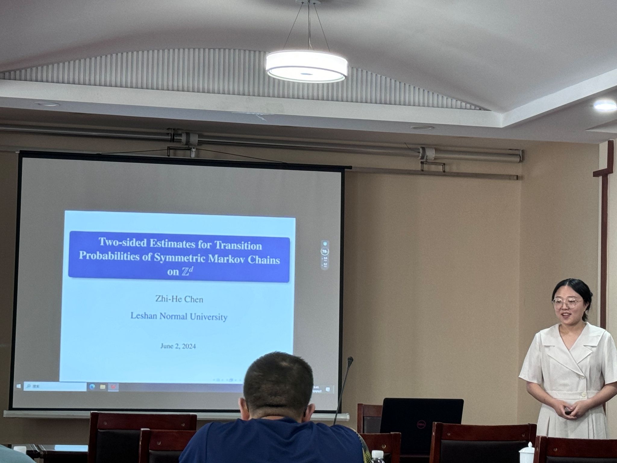 我院教师陈芷禾在会上做了题为“Two-sided Estimates for Transition Probabilities of Symmetric Markov Chains on Z^d”的专题报告。报告介绍了格子点空间上离散时间对称马氏链转移概率的双边估计,并介绍了热核估计在随机过程样本轨道中相关性质和在随机分形中的应用,内容丰富、思路清晰,获得了与会者的认可。通过参加本次学术会议,我院教师不仅展示了自己的科研实力和学术水平,还与其他专家学者建立了广泛的联系和合作,他们表示,将以此次会议为契机,进一步加强与国内外同行的交流与合作,推动学院科研工作的深入发展。
