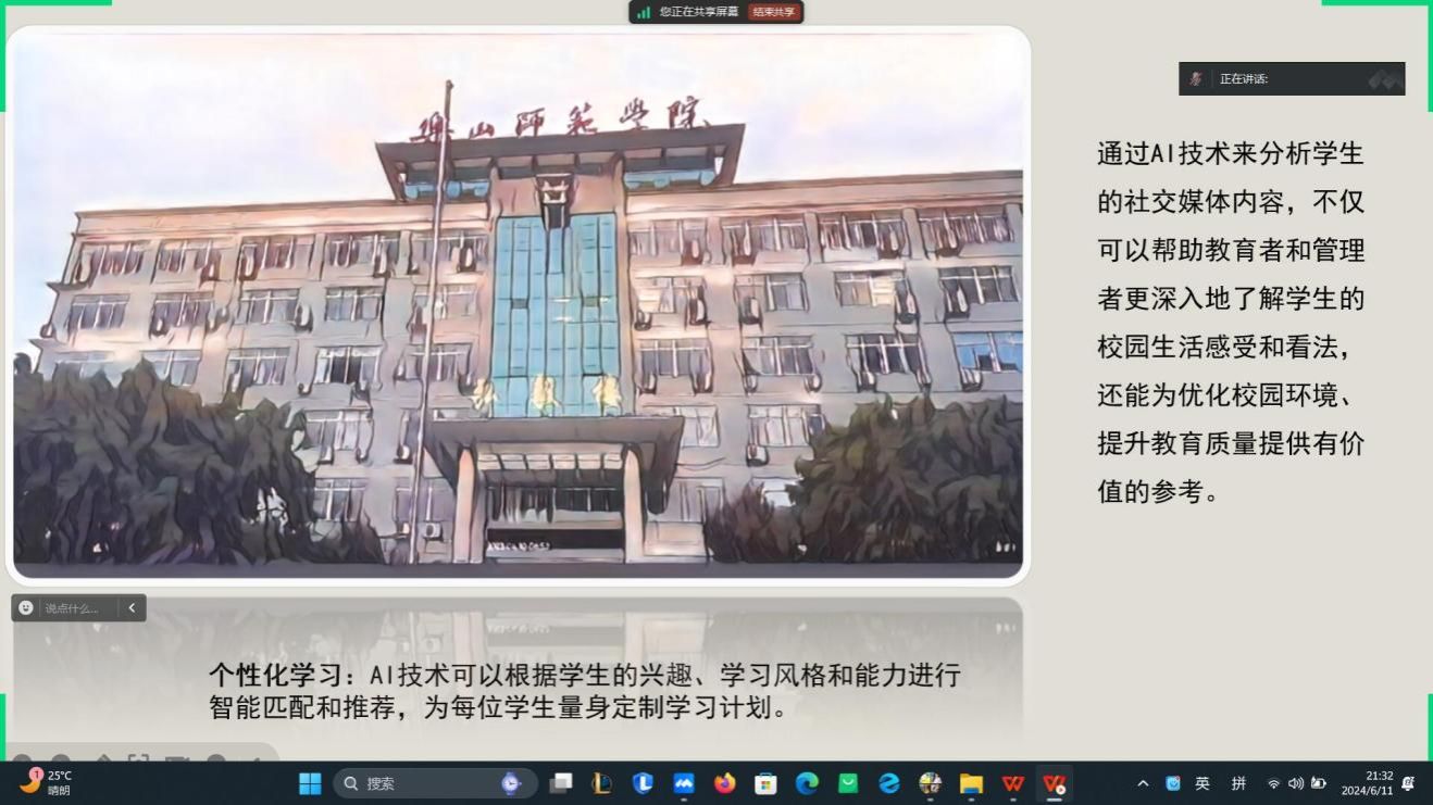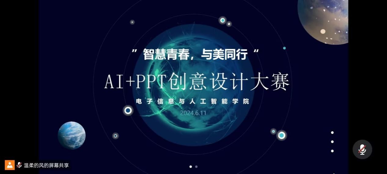本网讯(文/刘鹏,图/刘鹏、郑魏)6月11日,电子信息与人工智能学院结合专业特色在线上举办“AI+艺术”美育浸人心系列活动之一——“AI+”PPT创意设计大赛1期,旨在进一步提升学生的艺术审美能力和创新思维,通过结合人工智能技术,打造独特的艺术表达形式,让学生在实践中感受美的力量,享受创造的乐趣。本次活动由AI之家辅导员工作室主办,分团委协办,学院部分学生共同参与。