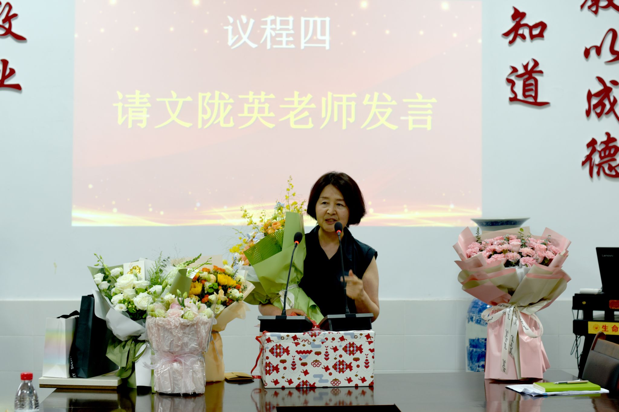 接着,文老师发表了退休感言。她脸上洋溢着幸福的笑容,眼中闪烁着感动的泪花,心中充满感慨和不舍,表达了对学院领导、同事、学生的感激之情,感谢大家对她多年工作的关心、支持和帮助。文老师表示退休意味着一个新的开始,她将继续保持乐观向上的心态,享受生活,充实自己。同时,也将继续关注和支持学院的发展,为学院的未来贡献自己的力量。