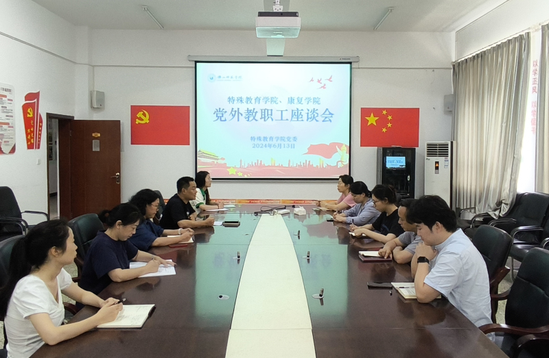 本网讯(文/杨燕 图/汪科) 6月13日下午,特殊教育学院党委在特A-408会议室召开了党外教职工座谈会。学院党委书记刘宗泉,分管统一战线工作的党委副书记、院长张梅,党政办公室主任杨燕和学院全体党外教职工进行了座谈。座谈会由刘宗泉主持。