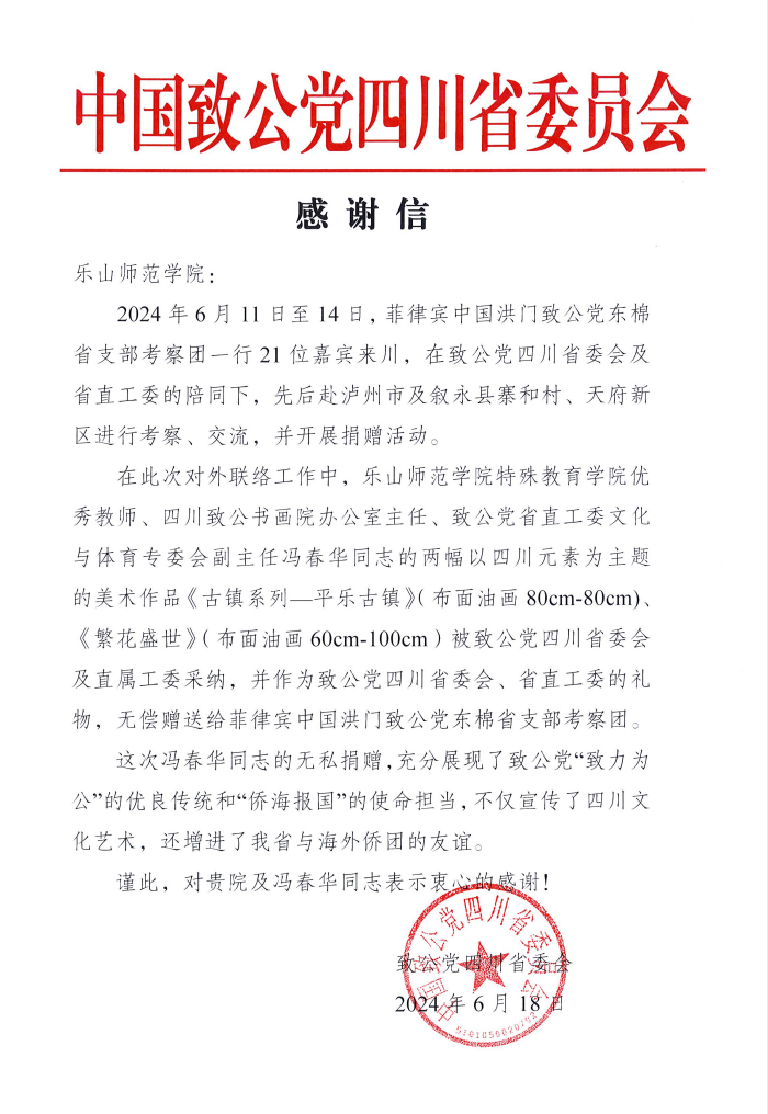 本网讯(文图/张梅) 近日,学校特殊教育学院专任教师、致公党党员冯春华的两幅绘画作品《古镇系列-平乐古镇》和《繁华盛世》被中国致公党四川省委员会采纳后,转送给了菲律宾中国洪门致公党东棉省支部考察团。为此,中国致公党四川省委员会给学校发来感谢信,感谢冯春华老师的无偿捐赠,表示冯春华老师的行为充分展现了致公党“致力为公”的优良传统和“侨海报国”的使命担当,不仅宣传了四川文化艺术,还增进了我省与海外侨团的友谊。(审核人:刘宗泉)