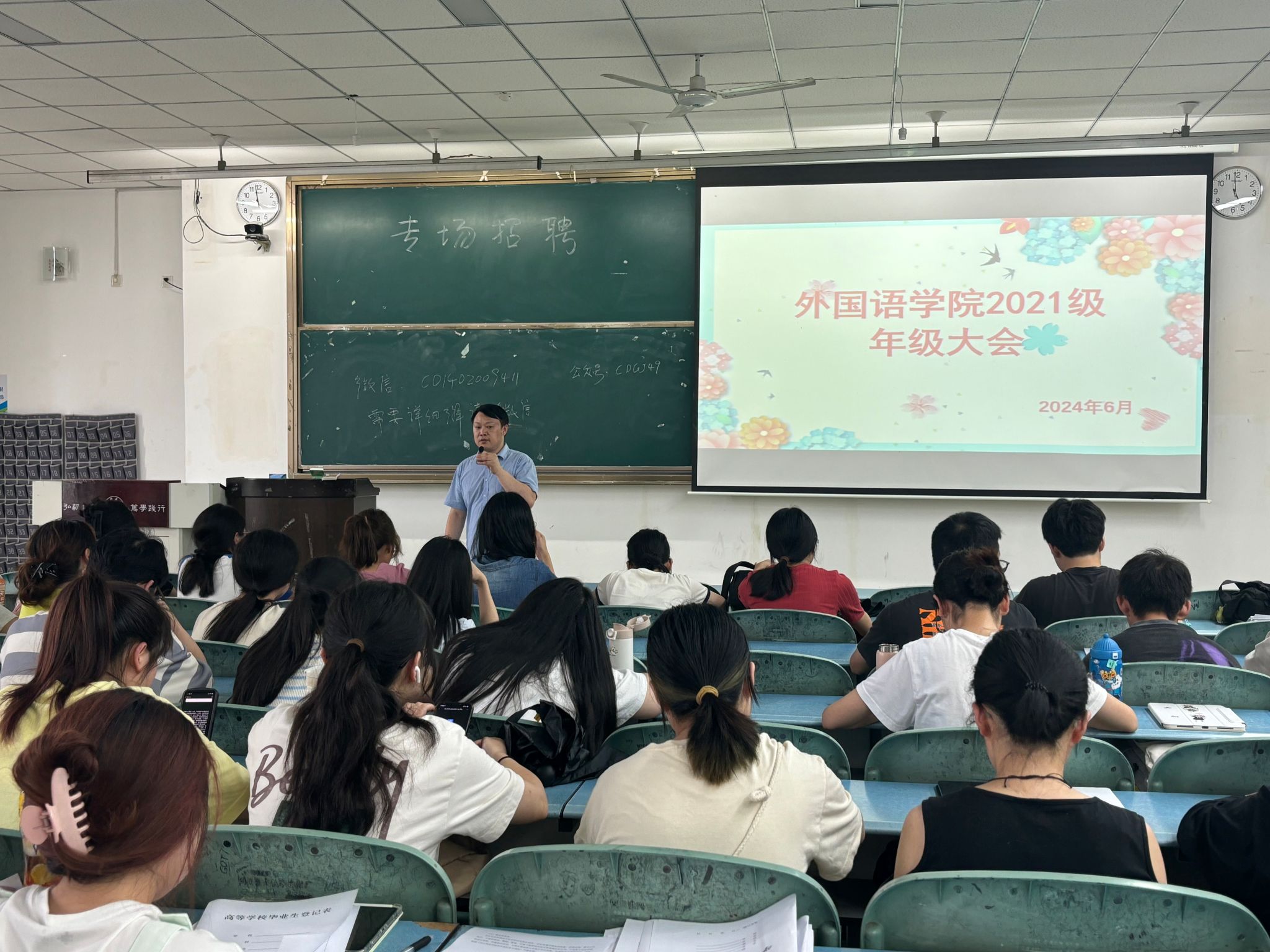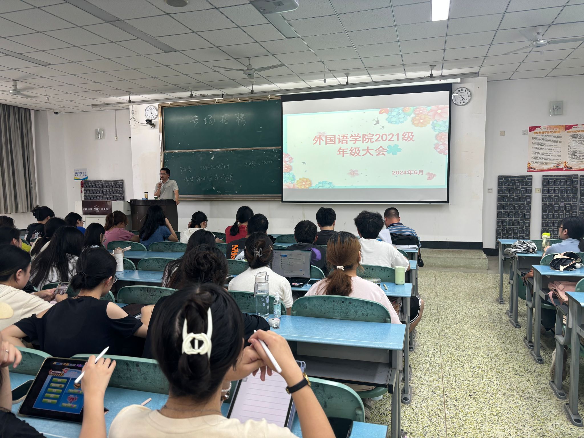 本网讯(文/曹琳、刘悦 图/谢颖霖)6月21日,外国语学院在行知楼125、225举办了2021级年级大会暨考研交流指导会。学院党委书记袁明锋、院长江世勇、党委副书记吴小彦、副院长陈开富、徐波、各考研方向指导老师参加,大会由21级辅导员曹琳主持,21级全体学生参会。