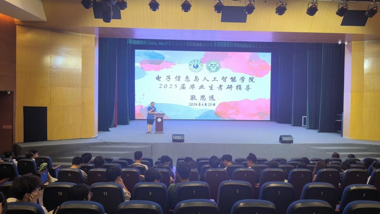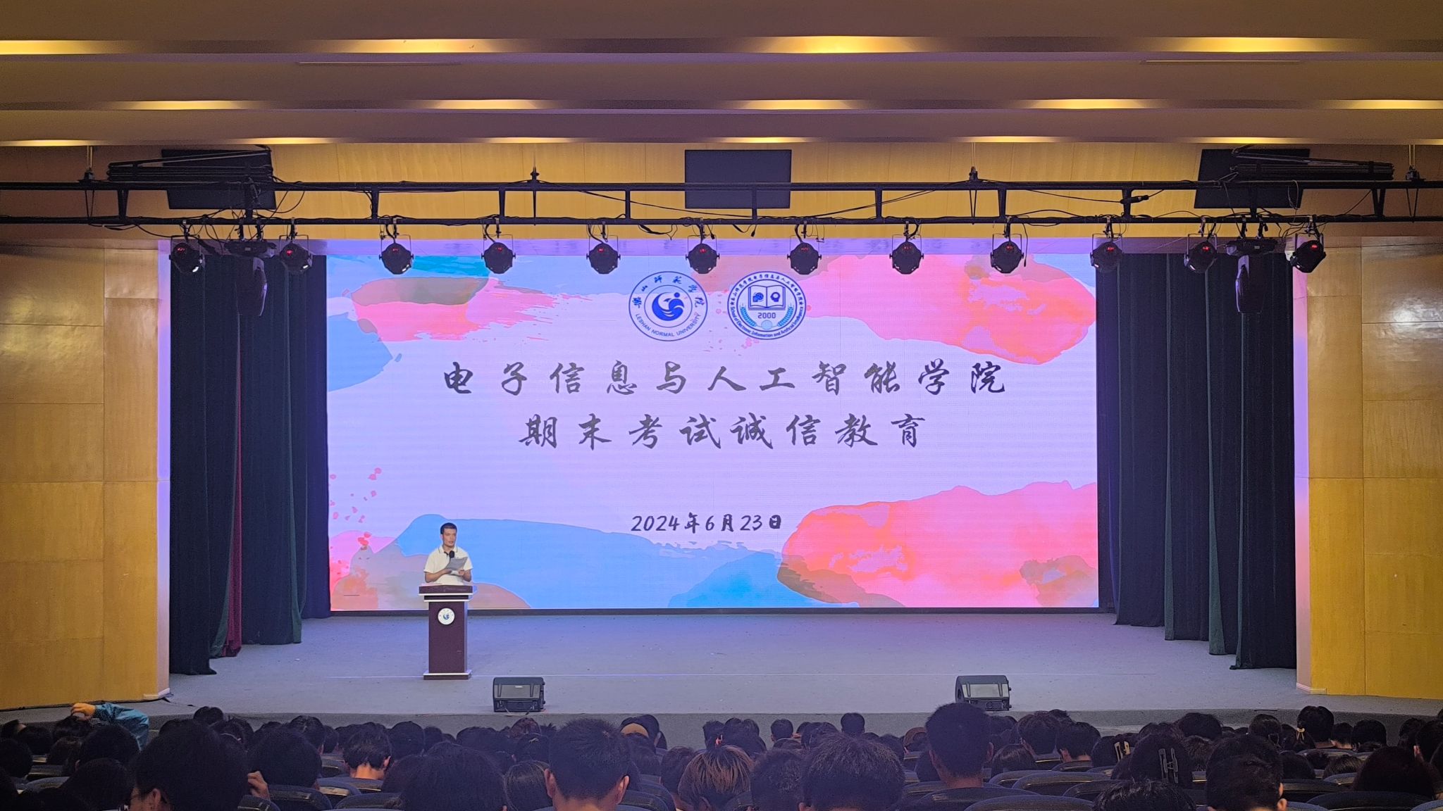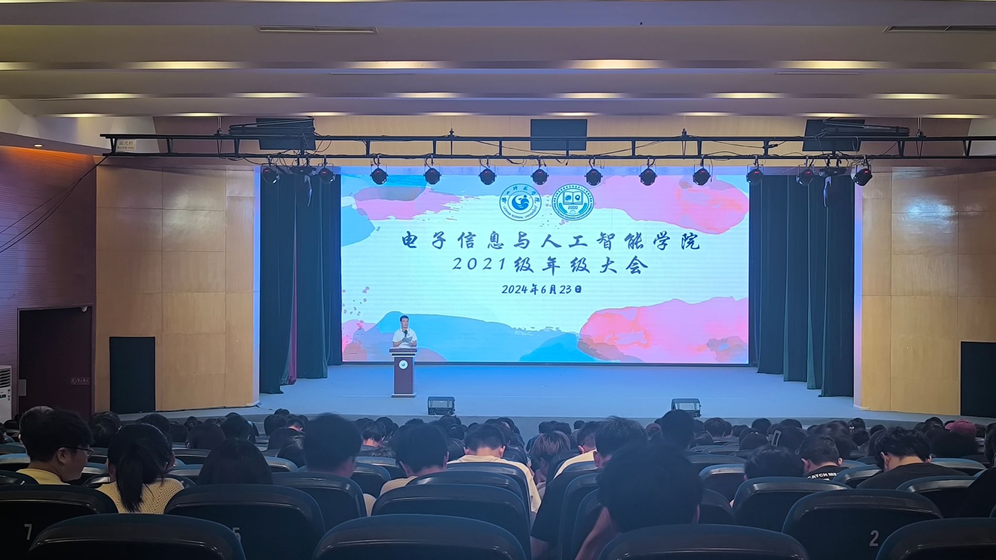 本网讯(文/官辉 图/张宇昊)6月23日,电子信息与人工智能学院为了进一步加强学生的期末考试诚信教育,提高毕业生的考研就业竞争力,以及深化对毕业论文撰写和实习的认知,特别举办了一场综合年级大会。本次会议由AI之家辅导员工作室主办,电智学院党委副书记李骏、电智学院专任教师项炜、考研专任指导教师敬思远、分团委书记强光平、辅导员雷雄锴、肖苗、狄红霞主讲,全学院各年级的学生共同参与。