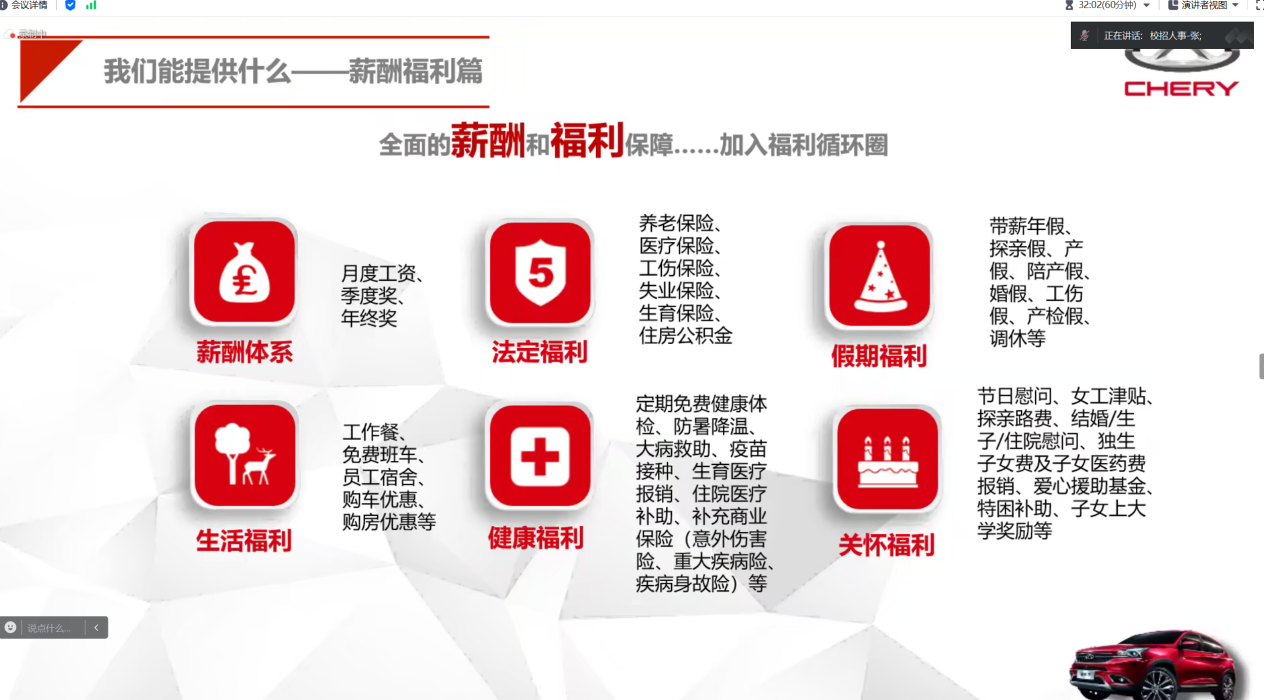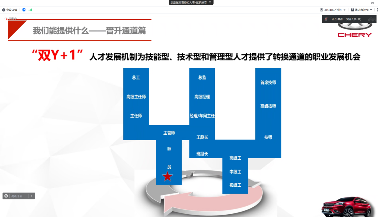 宣讲会上,奇瑞汽车股份有限公司的资深HR首先向与会者介绍了公司的基本情况和发展历程。奇瑞汽车作为中国汽车行业的佼佼者,一直致力于技术创新和品质提升,不断推出具有竞争力的新产品,赢得了市场的广泛认可。同时,公司也高度重视人才培养和引进,为员工提供了广阔的发展空间和良好的福利待遇。