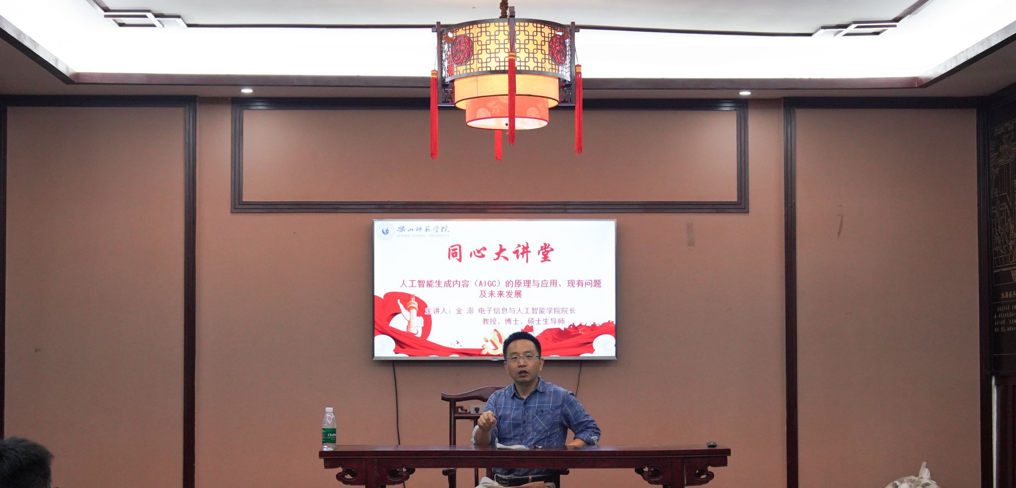 在同心大讲堂环节,学校电子信息与人工智能学院党委副书记、院长金澎教授为参会人员作了题为“人工智能生成内容(AIGC)的原理与应用、现有问题及未来发展”的讲座,他用详实的数据和行业典型应用,从什么是ChatGPT、ChatGPT有哪些应用、自己的一点思考三个方面深刻阐述了以ChatGPT为代表的人工智能发展演变过程,并介绍了在教育、办公、汽车、数字员工、医疗等行业应用。深入浅出地讲解,让与会人员受益匪浅。