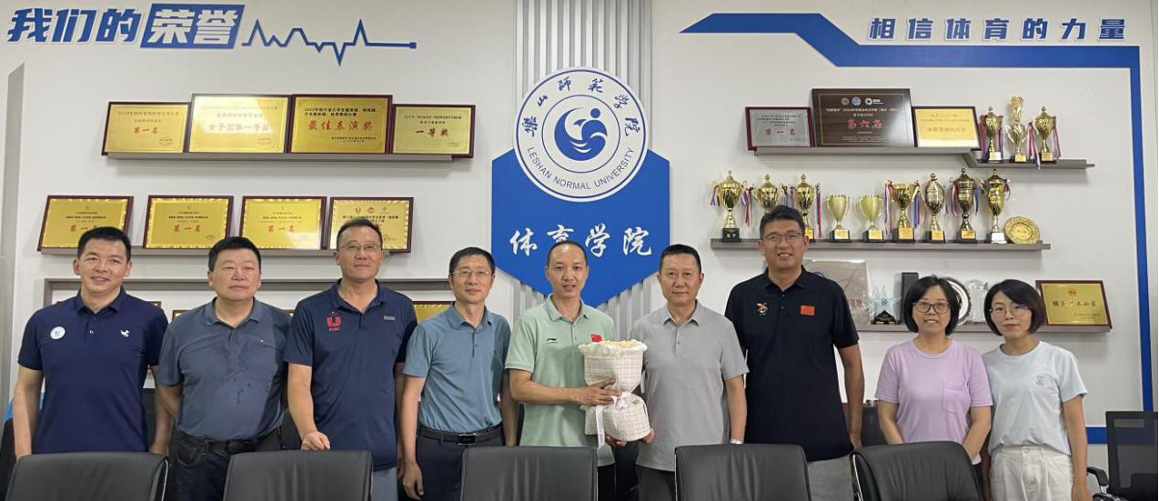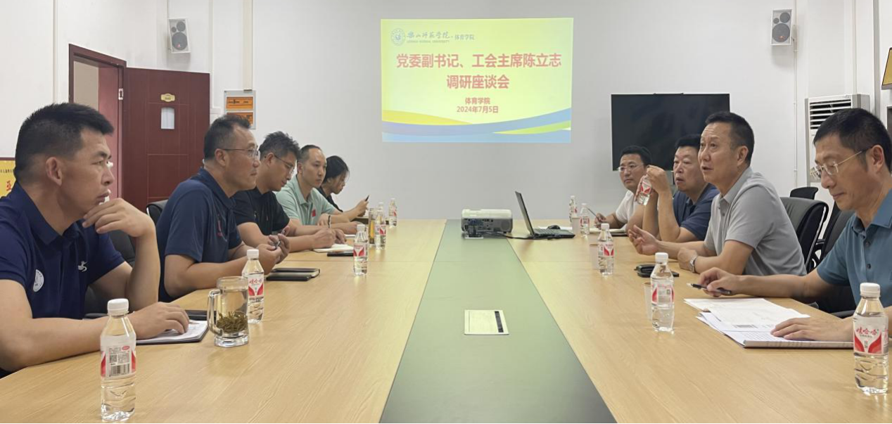 本网讯(文图/裴庚)7月5日下午,乐山师范学院党委副书记、工会主席陈立志带队到体育学院调研指导工作,校工会常务副主席李同果,副主席方忠、黄宽娜陪同调研。体育学院党委书记钟大勇、院长张峰、副院长张爱平、运动与健康实验实训中心主任谢凯及乐山师范学院健身健美协会负责人参加了会议,会议由陈立志主持。