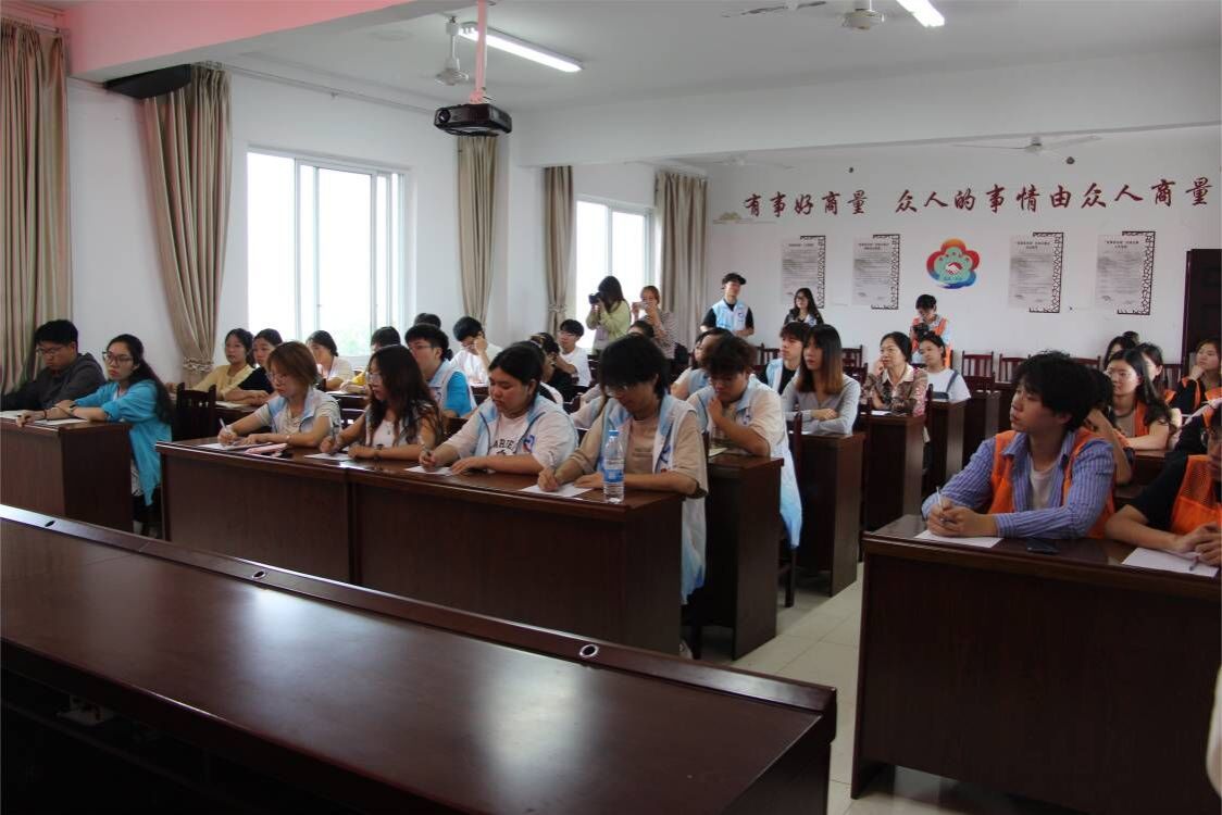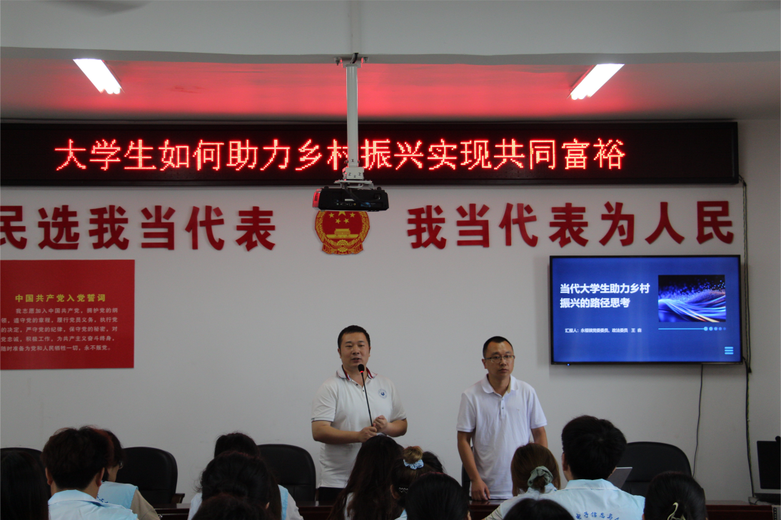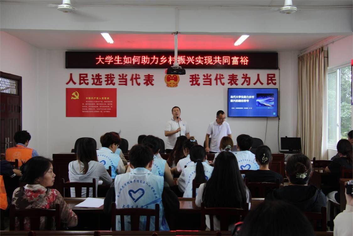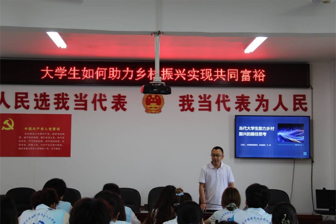 本网讯(文/郭正兴,图/明爽)7月8日,电子信息与人工智能学院在乐山市沐川县永福镇张村村村委会二楼会议厅参加了以“助力乡村振兴”为主题的讲座活动,旨在引导和帮助青年学生更加深刻理解“乡村振兴”这一国策,鼓励青年在乡村振兴工作中建功立业,绽放青春风采。本次讲座由乐山师范学院党委学生工作部驻村干部宋家伟主持,永福镇党委委员、政法委员王森主讲,张村村部分村干部以及电子信息与人工智能学院部分师生代表共同参与。