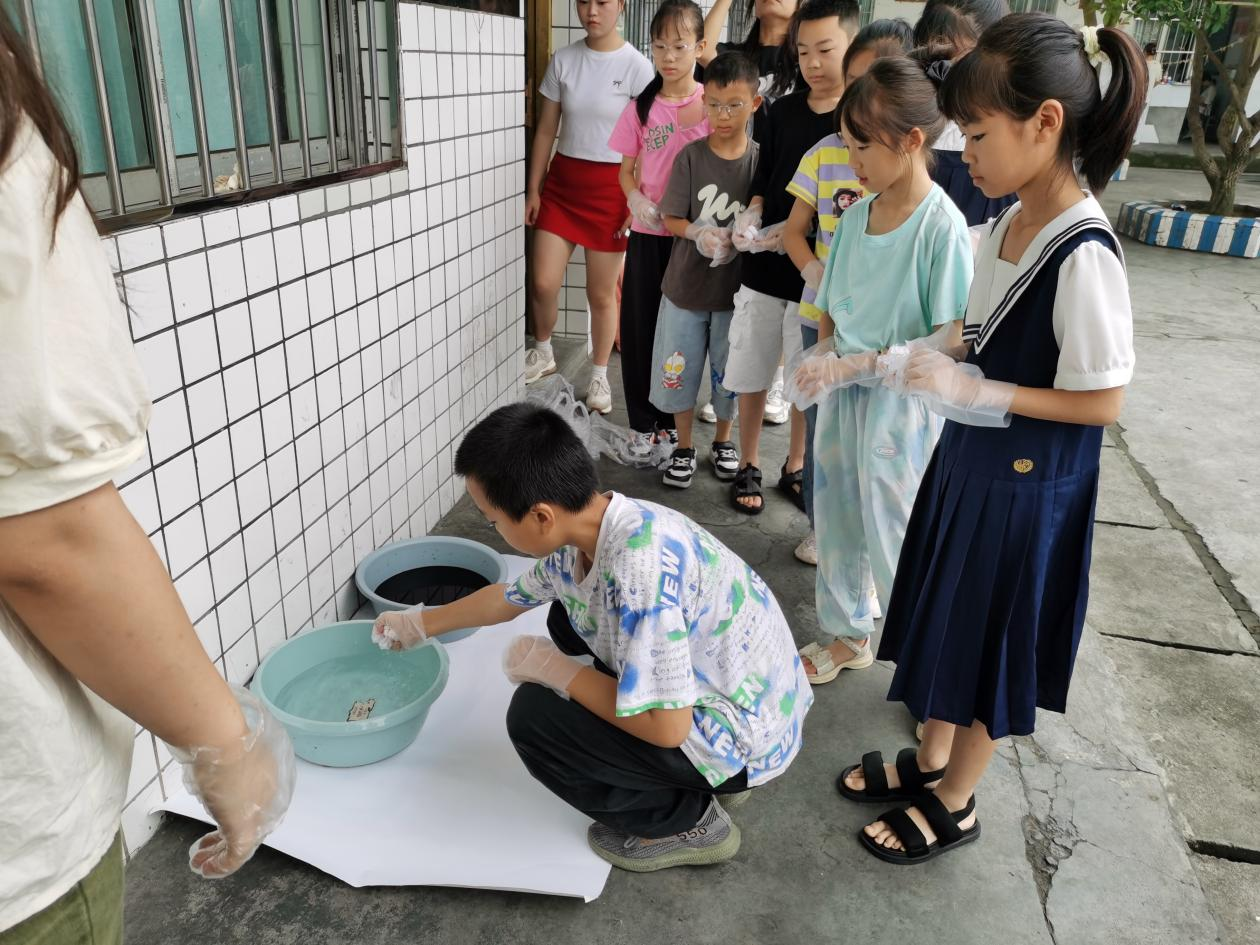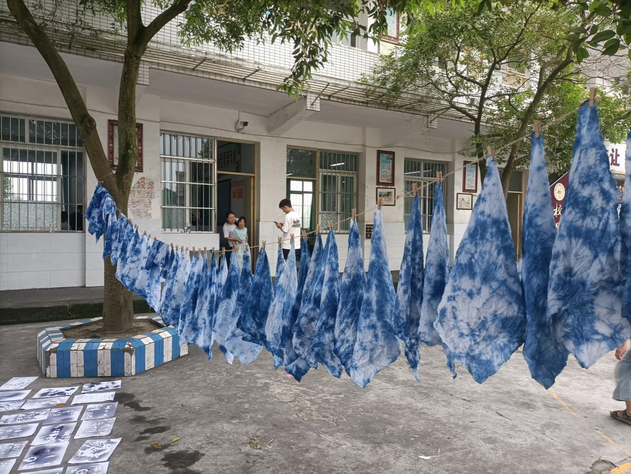 在夏日的阳光下,一场特别的美术教学活动在罗城小学的校园里展开。首先,志愿者向奕向孩子们介绍了扎染的历史和文化背景,让孩子们了解到这项技艺不仅美观,还承载着中华民族的智慧和创造力。然后,她还详细展示了扎染的具体步骤,包括设计图案、扎绑、浸染、解绑和漂洗等过程。最后,孩子们在志愿者的指导下一起完成了扎染作品。