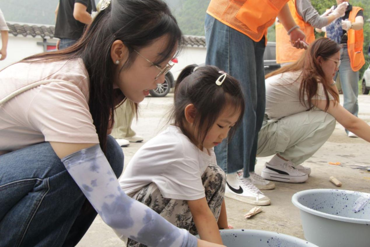 随着讲解的深入,一行人移步至小院。这里,九个小分队迅速集结,每一队都像是即将出征的勇士,满怀信心地投入到扎染的创作中。小手与布料、线绳共舞,每一次穿梭都蕴含着孩子们对美的追求与想象。不久,一幅幅充满童趣与创意的扎染作品便展现在众人眼前,它们不仅是孩子们纯真梦想的缩影,更是对美好未来的无限憧憬。