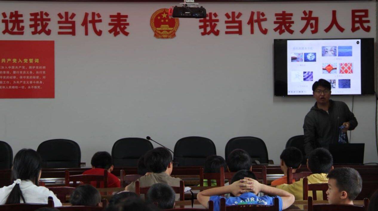 教室里,产品设计专业的李科佳为小朋友们讲述着轧染的悠久历史与制作过程、精湛技艺。张村村的小朋友们端坐如松,眼中闪烁着对未知世界的好奇与渴望,仿佛已经迫不及待想要亲手触摸那些斑斓的色彩。
