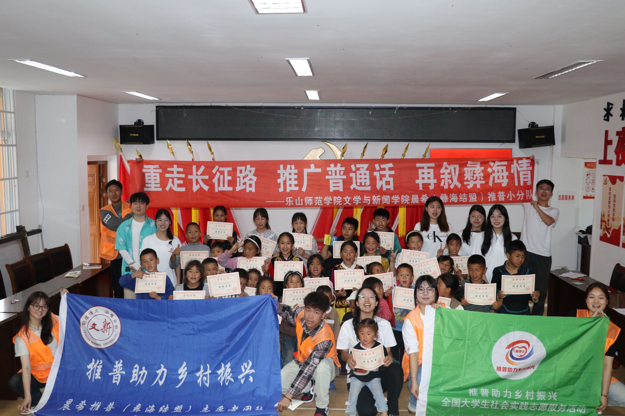 本网讯(文/伍艾华 图片/伏智宏、杨林峰)为加大普通话推广力度、弘扬中华优秀传统文化,为民族地区乡村教育注入新活力,助力乡村振兴战略在文化传承领域取得新成效,文学与新闻学院晨希推普(彝海同盟)志愿者团队于7月10日分别开展了讲好中国故事、“粉书意境”、折纸艺术、送教上门和重走长征路等一系列普通话推广课程。