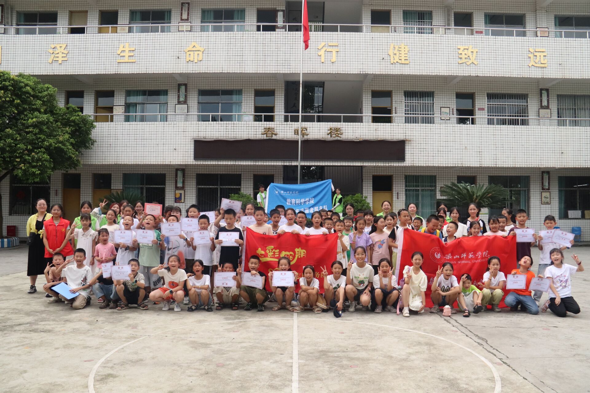 本网讯(文/熊与欢 图/张媛、莫云敏)时光荏苒,日月如梭。乐山师范学院教育科学学院、数理学院、美术与设计学院27名志愿者组建的乐芽志愿服务团赴犍为县罗城镇中心小学开展了为期7天的“语韵悠扬,心桥相联”的七彩假期及“三下乡”社会实践活动。活动主要围绕心理团辅课、朗诵课、手工课、课本剧课、科学课、音乐课、舞蹈课、体育课、美术课、趣味数学课等内容展开,以互动体验式的教学方式给孩子们带来别样的七彩假期体验。