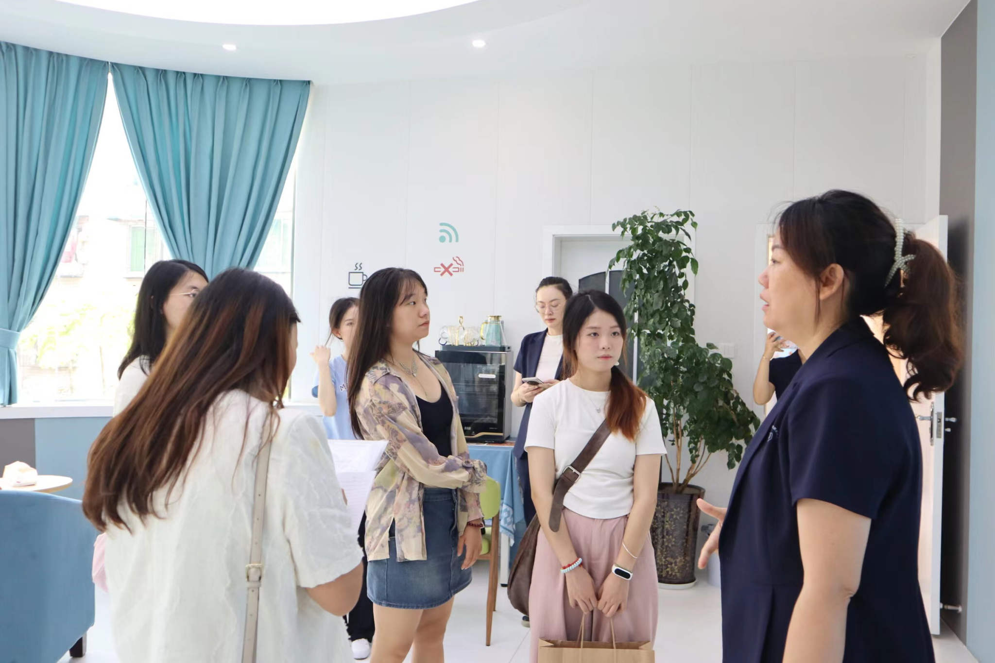 下午2点30分,卢艳萍老师又带学生来到金牛区退役军人服务社区,机构负责人张诗媛老师带领大家参观了大门口的创新活动“言心咖啡”,在服务中心内部依次参观了矛盾调解室、舒适咨询室,还简单参观了工作人员的办公室,中心最深处是一间很宽敞的团辅室,装修十分温暖,平常会在这里开展一些团体活动,如睡眠疗愈活动,帮助大家提高睡眠质量;团辅室的窗外是疗愈花园,环境优美舒心。除了参观环境,负责人还向大家介绍了他们的创意作品,有服务中心的卡片,上面有中心的公众号;还有中心设计的文创,如《花园的力量》,对那些不愿意倾诉的居民,他们可以通过曼陀罗绘画,涂涂画画,慢慢去平静内心,另外,还有情绪转盘,搭配自创的《答案之书》,让大家体会到心理学的有趣之处和生活化;中心还在可以利用的墙上粘上了软的毛毡布,把居民和工作人员的作品以及照片展示给大家,营造了一种暖心的氛围,以便更好地进行服务。