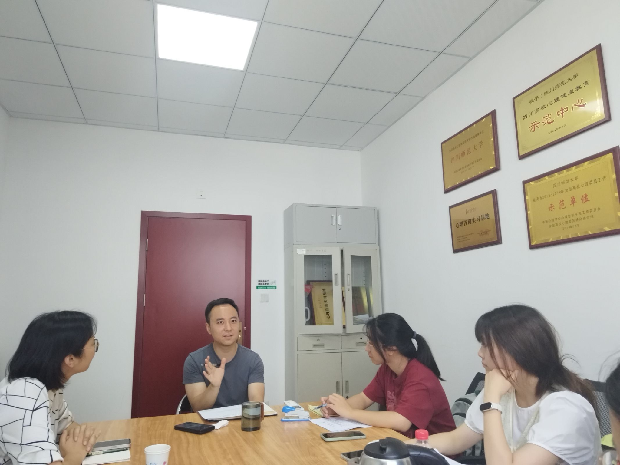 在另一边,陶媛老师又带领心理学系学生来到四川师范大学狮子山校区,与学校心理健康中心负责人罗老师进行调研访谈。罗老师详细介绍了本校心理健康教育中心基本工作内容以及在校学生心理健康情况。双方就学校心理健康教育中心的发展与前景展开了热烈的讨论