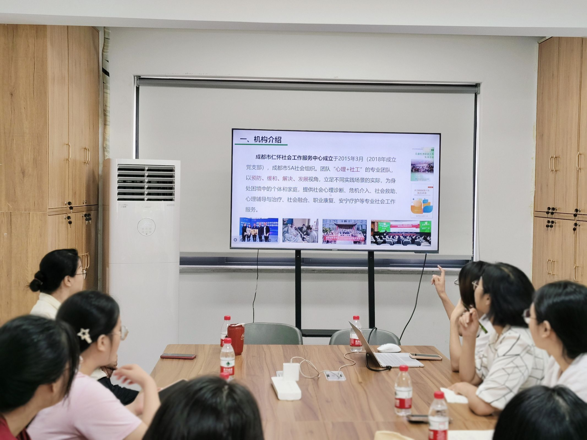 在调研访谈时,仁怀机构中心理事长冉启浩老师就中心的社工服务和社会心理服务工作概况进行交流。中心督导张琴老师详细介绍近年来中心按照"立足服务场景,坚持专业支撑、回应重点需求"的社会心理服务路径,在街道、学校、医院、社区、关爱援助站(室)等多个服务场景,建立跨专业跨学科跨领域的服务队伍,开展多元化、专业化、系统化的社会心理服务实践及研究工作。同时仁怀中心还邀请成都五四三机构的张惠敏老师做社会心理服务交流,共同研讨社会心理服务机构参与大学生心理健康工作的联动机制、服务路径、具体内容及形式等。