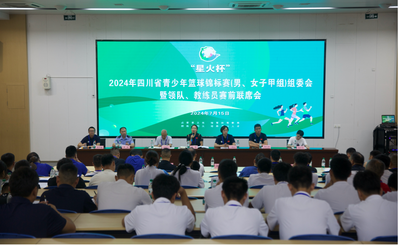 2024四川省青少年篮球锦标赛(男、女甲组)组委会暨领队、教练员赛前联席会在乐山高新区嘉祥外国语学校中学阶梯教室举行。四川省体育局青少年体育处处长殷剑,四川体育职业学院篮管中心书记、主任王晓亮,乐山市体育局副局长聂朝飞,乐山师范学院体育学院党委书记钟大勇,乐山师范学院体育学院副院长张孝禄,乐山市高新区公安分局巡特警大队大队长曹波,乐山市高新区融媒体中心孟江昊,赛事裁判员和各参赛队领队、教练员出席了会议,会议由乐山师范学院体育学院副院长张孝禄主持。