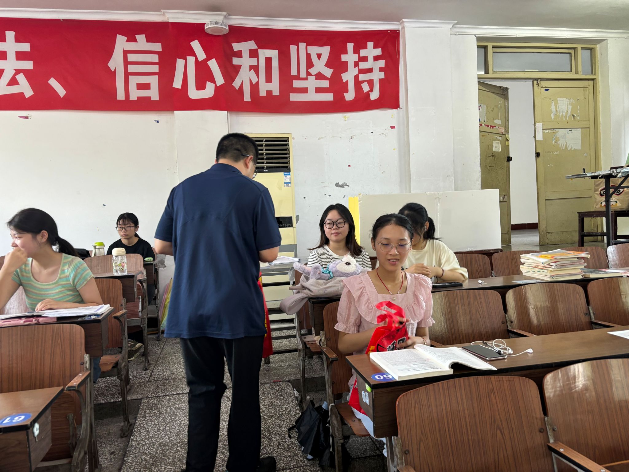 本网讯(文、图/曹琳)炎炎夏日,为传递学院对暑期留校考研复习同学的关怀,深入了解同学在校情况,8月17日,外国语学院书记袁明锋、院长江世勇、副院长陈开富、副院长徐波、辅导员曹琳前往旷怡楼考研自习室慰问留校考研同学。