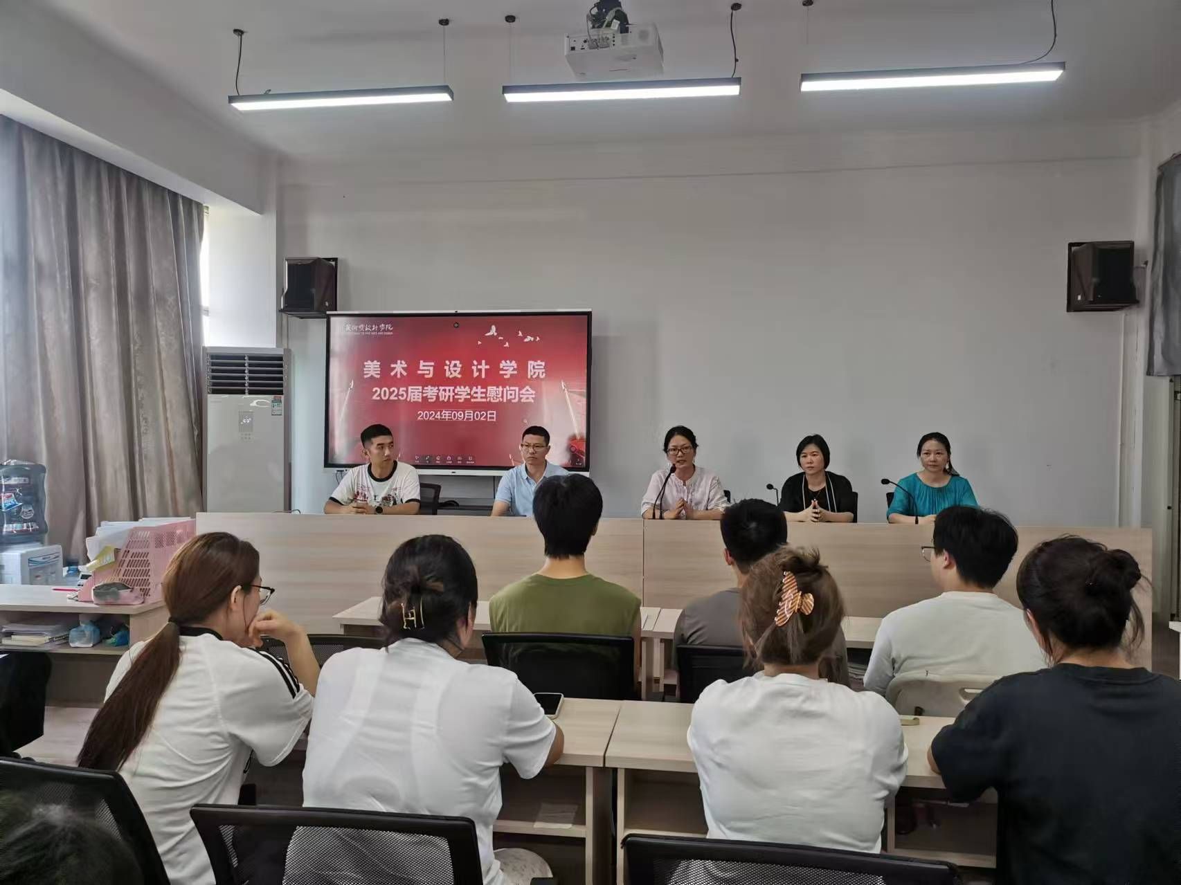 本网讯(文/刘桐江 图/崔玉)为深入了解考研学生的学习生活情况,坚定考研学子的奋斗目标,舒缓备考压力,9月2日,美术与设计学院对2025届考研学生进行了亲切慰问。学院党委书记王孝琴、院长熊火花、副书记赵元、副院长任素梅、学生科长崔玉和全体暑期留校考研学生参加会议。会议由辅导员刘桐江主持。