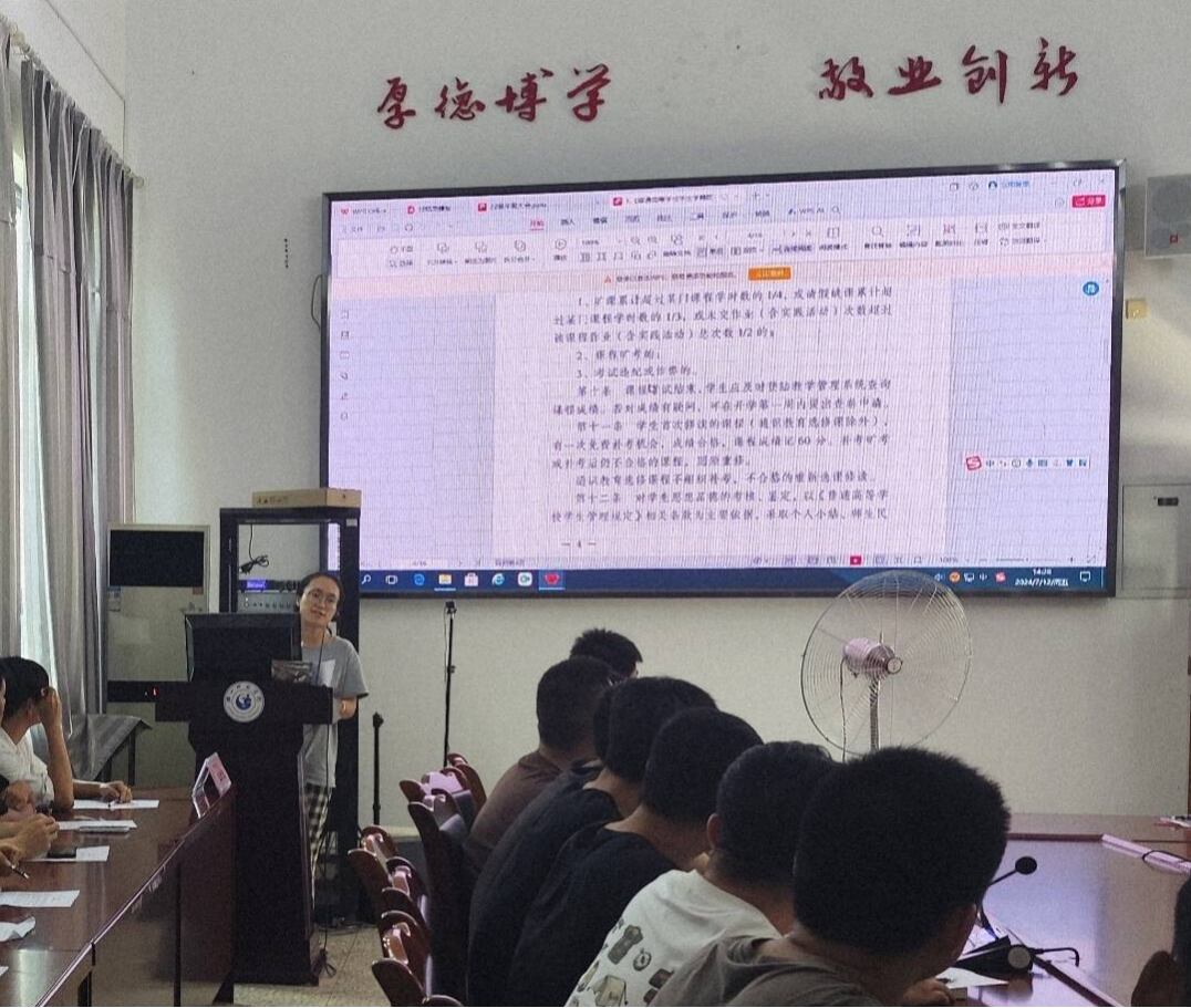 肖苗带领新生学习《乐山师范学院学生学籍管理规定》《学生手册》等重要文件,就学生资助、校规校纪、学分管理、奖学金评奖、第二课堂辅助管理等制度展开详细介绍,提醒同学们遵守学校有关规章制度,做好学业规划,尽快熟悉、适应新的环境,在青春赛道上奋力奔跑。最后,重点在防溺水、防高温、防诈骗等几个方面进行安全教育,希望同学们能够提高安全意识,保护好个人的人身安全。