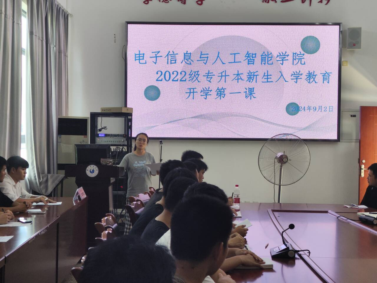 本网讯(文图/姜星宇)为扎实推进专升本新生入学教育相关工作,帮助专升本新生们实现角色转变,尽快适应新的大学生活。9月2日,电子信息与人工智能学院在特教C501召开2022级专升本新生入学教育。本次活动由学院党委副书记李骏,辅导员肖苗主讲,2022级88名专升本新生参加。