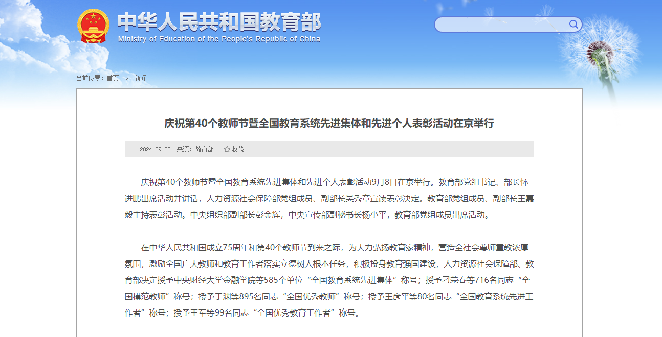 本网讯(文图/罗冰羽)为深入学习贯彻习近平总书记关于教育的重要论述,大力弘扬教育家精神,在全社会营造尊师重教的浓厚氛围,广泛凝聚建设教育强国的力量,激励全国广大教师和教育工作者落实立德树人根本任务,积极投身教育强国建设,9月8日,庆祝第40个教师节暨全国教育系统先进集体和先进个人表彰活动在京举行,会上对“全国教育系统先进集体”“全国模范教师”“全国优秀教师”“全国教育系统先进工作者”“全国优秀教育工作者”进行了表彰。简敏校友荣获“全国优秀教育工作者”,陈姝校友荣获“全国优秀教师”。