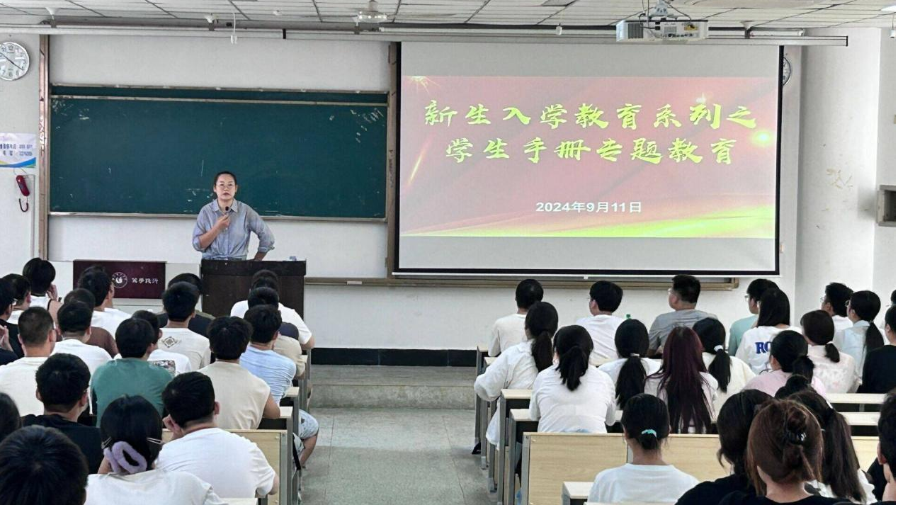 本网讯(文/姜星宇,图/陈璐)为进一步做好2024级新生入学教育工作,引导学生尽快适应大学生活,提高学生遵章守纪的主动性、自觉性,使学生明确校规校纪,规范言行举止,建立良好的校园环境,9月11日,电子信息与人工智能学院组织学生在行知楼114学习《学生手册》,本次活动由辅导员狄红霞主持,2024级全体新生共同参与。