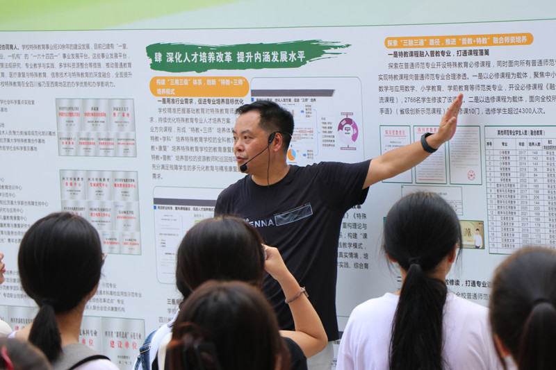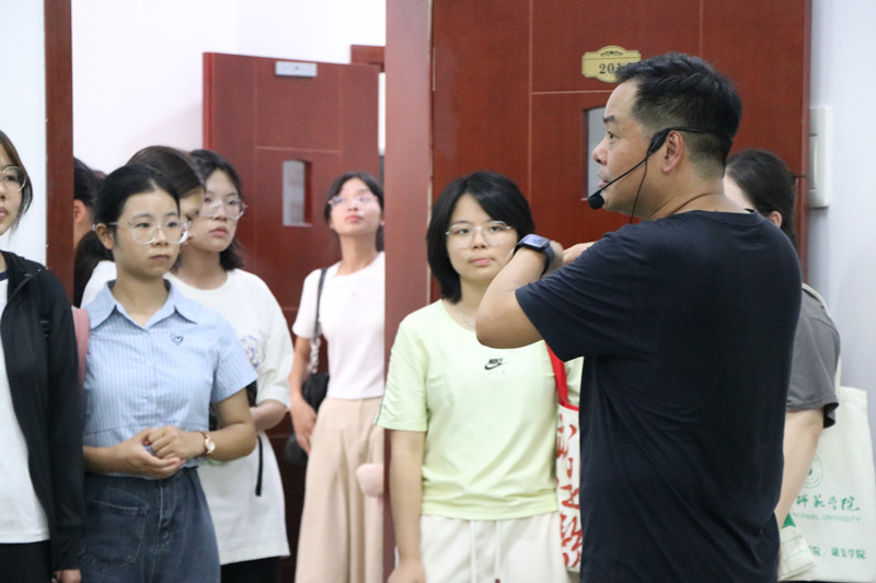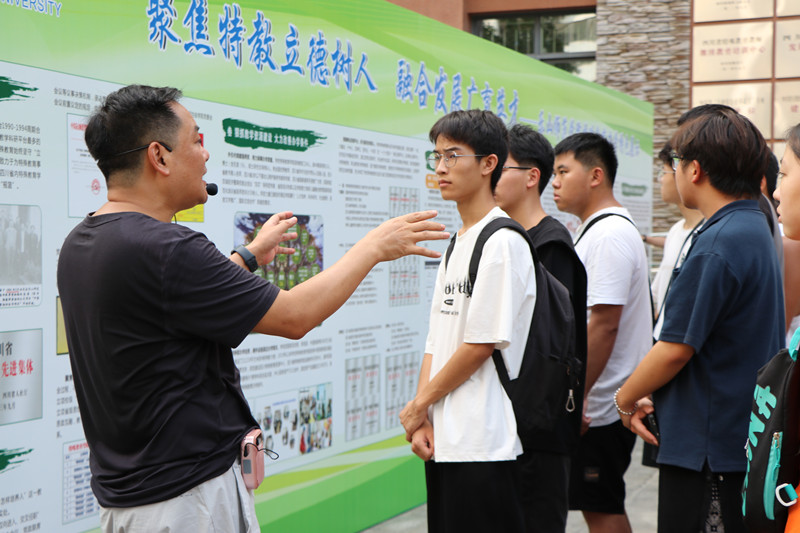随后,刘书记详细介绍了学院目前的工作开展情况、现状以及对未来的美好期待。他带领同学们从特教A栋大门口的宣传展板开始,逐一介绍了学院发展情况,并自豪地向同学们展示了学院的奖牌,彰显了学院的辉煌成就。同时他还详细介绍了学院考研情况,激励新同学们以他们为榜样,努力学习,追求卓越。此外,他还带领同学们参观了国家语言文字推广基地(乐山师范学院)——视力残疾和听力残疾人员普通话测试站。