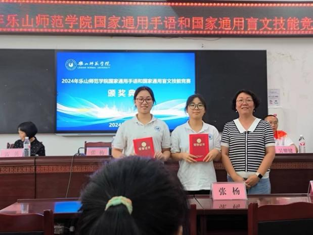 本网讯(文/黄雪影、陈越 图/袁静婷)在9月13日下午刚刚结束的2024年乐山师范学院国家通用手语和国家通用盲文技能竞赛中,来自旅游与地理科学学院的袁静婷、胡益萍老师带领的黄雪影和陈越团队荣获非专业组团体第一名。这场以“心手舞青春,指尖读世界,同筑中国梦”为主题的竞赛,旨在深入贯彻落实《国家通用语言文字法》精神,推广国家通用手语和盲文,提升大学生的专业技能和社会融合能力。