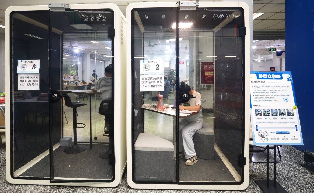 此外静音学习舱的建设,旨在为广大师生提供更加便捷、高效、舒适的学习与交流环境。静音学习舱,是专为创造无噪音环境而设计的封闭式舱室。舱内配备了简易书桌、舒适吧台椅以及充足的照明和通风设施,可有效解决了图书馆内噪音干扰的问题,无论是线上会议、小组讨论等提供独立安静空间,还是朗读练习、接打电话、直播等可能影响他人的活动,静音学习舱都能成为理想的选择。
