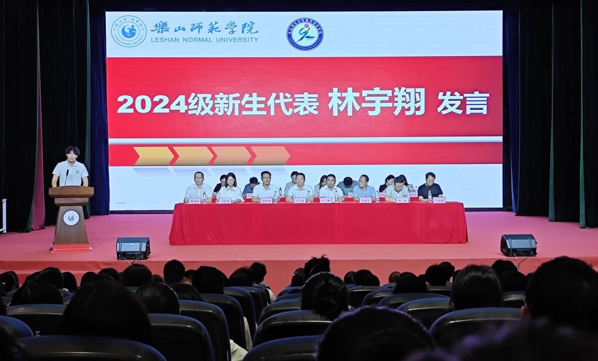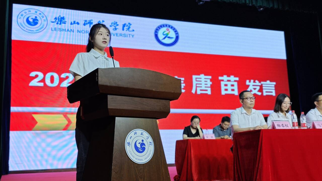 接着是高年级学生代表、新生代表发言。2022级优秀学生代表杨斯淇希望同学们不要仅局限于师范理论知识,更要学会在实践教学中运用,发现教学乐趣。还要积极参加社团以及志愿者活动,保持对生活的感知力!希望新生们成为勇敢坚毅的前行者,做一个内心丰盈的生活者。2024级新生代表唐苗的发言告诉同学们:“唯有勤奋才能收获,持之以恒才能实现梦想。”她鼓励大家在大学中卓越进取,多年后回忆起在乐师的学习生活时,无怨无悔!2024级新生代表林宇翔讲到,“我们不仅要追赶太阳,也要去试着寻找生活中的诗意。”他鼓励同学们要培养学科思维,找到适合自己的学习道路,希望大家把对生活的追求写进青春的每一个明天里,寻找大学生活的意义与方向!