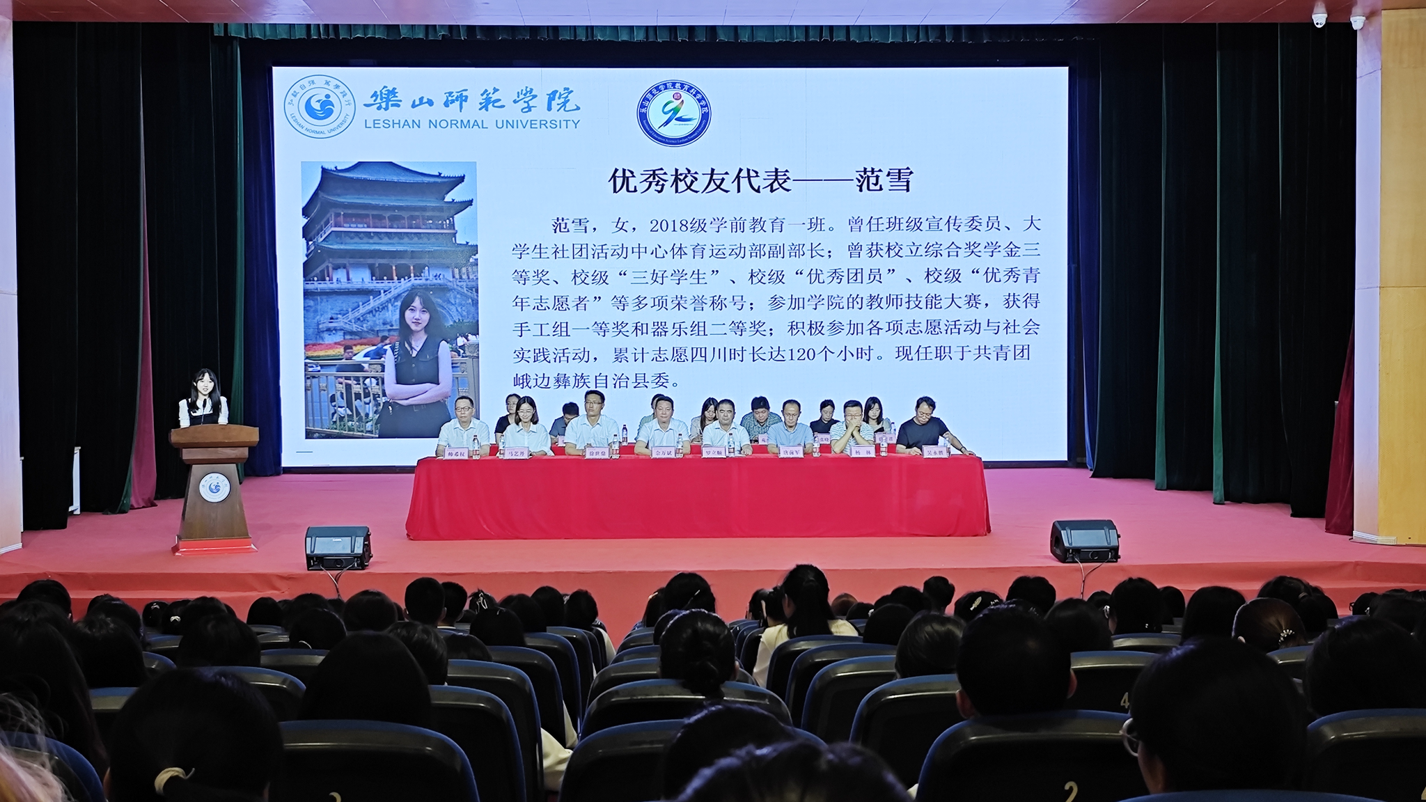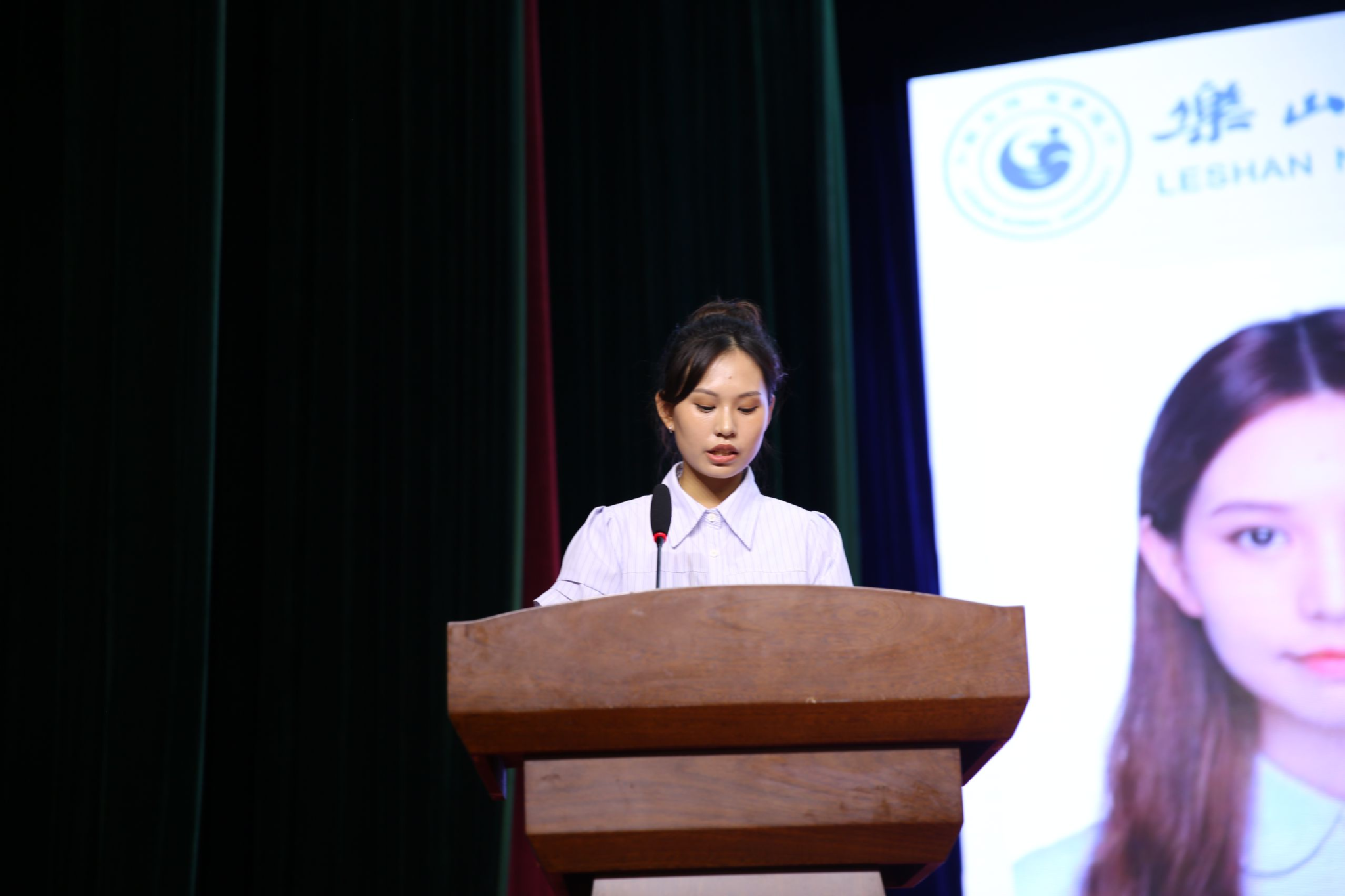 之后的议程是校友代表发言,学院邀请到2018级学前教育专业优秀校友范雪,2020级科学教育专业优秀校友贾子淇。范雪在演讲时分享了自己的大学学习经验,她谈到,“且将新火试新茶,诗酒趁年华”,她鼓励同学们在大学期间要挥洒汗水、拼搏青春,积极参加各种竞赛活动,希望大家要勇于担当、敢于创新,珍惜大学时光,不负韶华!贾子淇分享了她在大学期间如何一步一步取得各类证书和奖学金的经验以及这一路走来的心路历程,她坚持不懈,心向阳光,是乐师学子们的优秀榜样。在演讲的最后,她鼓励同学们将学习与实践生活相结合,多尝试自己没有参与过的事物,找到自己的学习节奏,书写多彩青春!