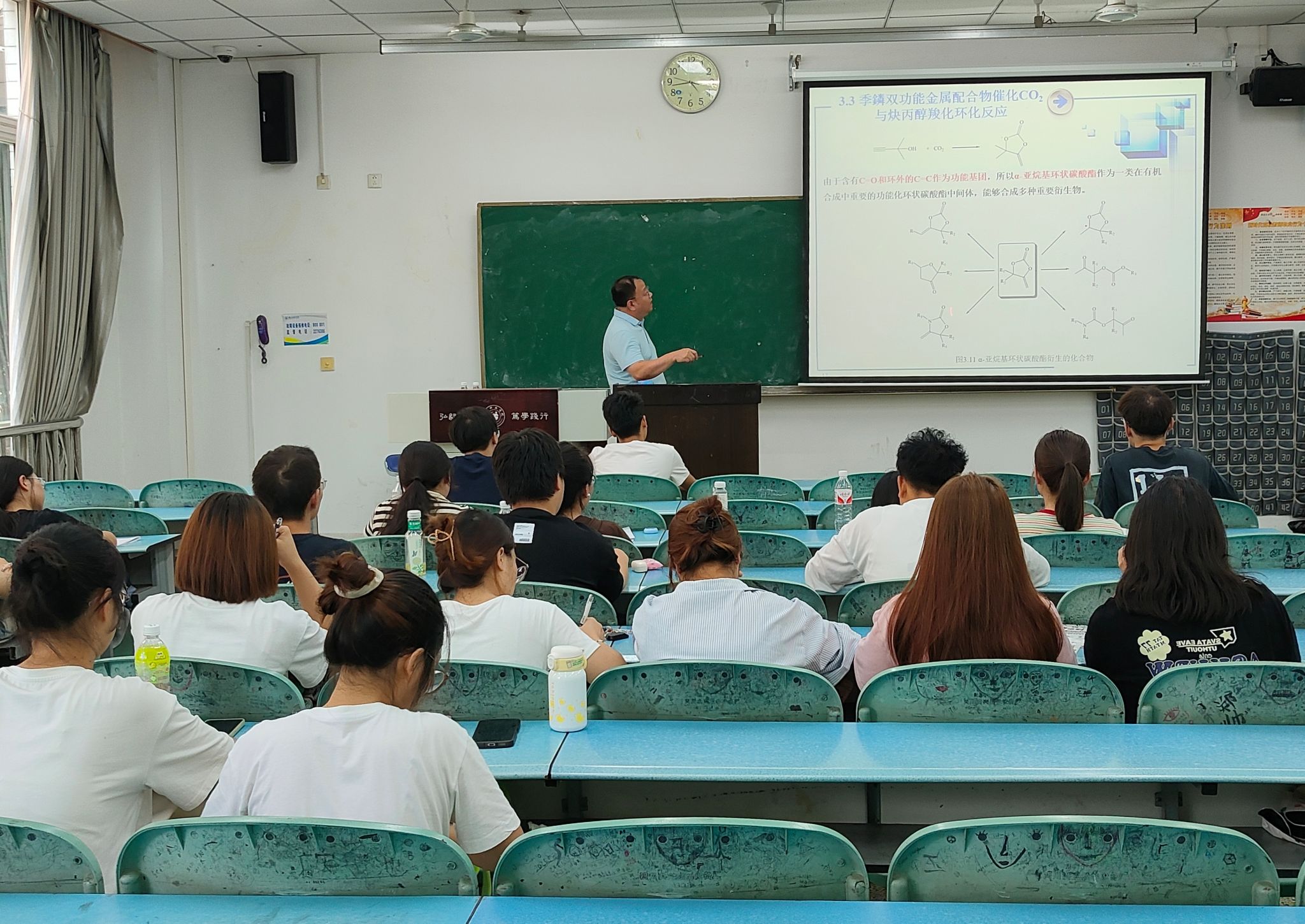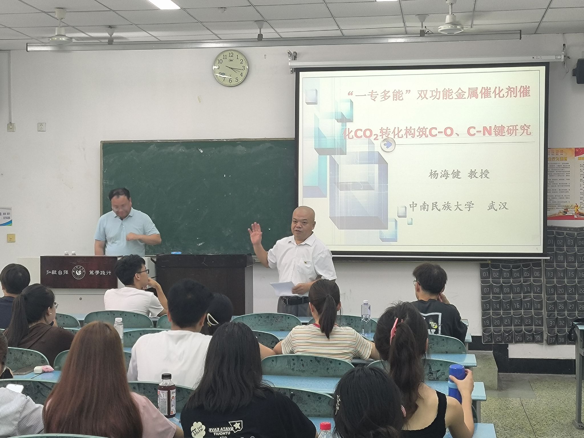 徐志高教授从稀土的分布、开采和处理应用等为同学们着重讲解了稀土材料相关方面内容。杨海健教授就“‘一专多能’双功能金属催化剂催化CO₂转化成C—O、C—N”做专项主题报告。两位教授对中南民族大学招生政策、报考条件做了详细的介绍,鼓励同学们积极报考。我院领导向中南民族大学杨海健、徐志高两位教授的到来表示热烈欢迎和感谢,一场充满激情又极富专业性的宣讲会落下帷幕。