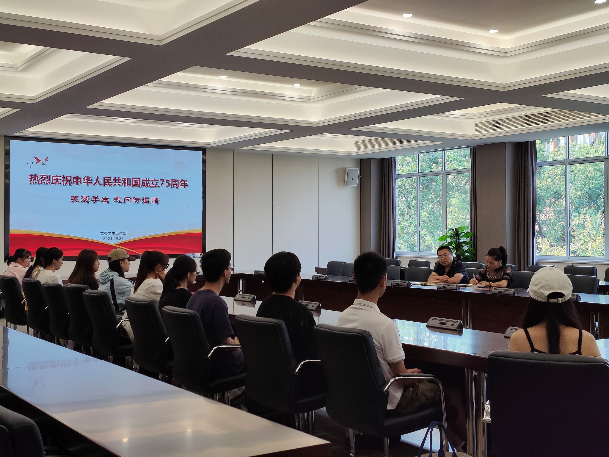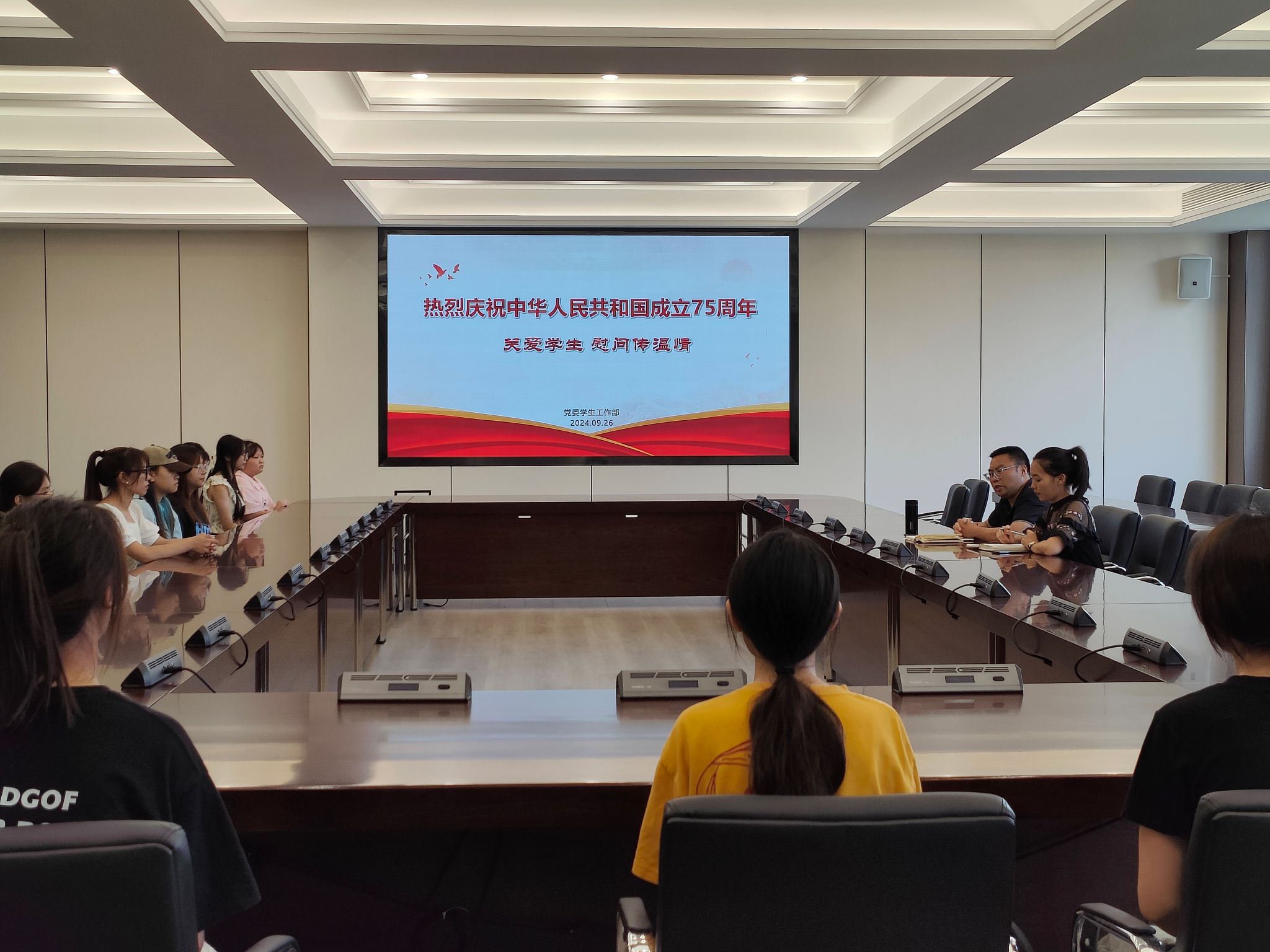 本网讯(文图/张馨月)国庆佳节将至,为庆祝中华人民共和国成立75周年,贯彻学校资助育人理念,给学生营造良好的学习生活氛围,9月26日下午,党委学生工作部于弘毅楼704会议室开展“庆祝中华人民共和国成立75周年——关爱学生 慰问传温情”资助慰问活动。党委学生工作部副部长胡平建、思政科科长谭妙、各学院学生代表参加本次活动。