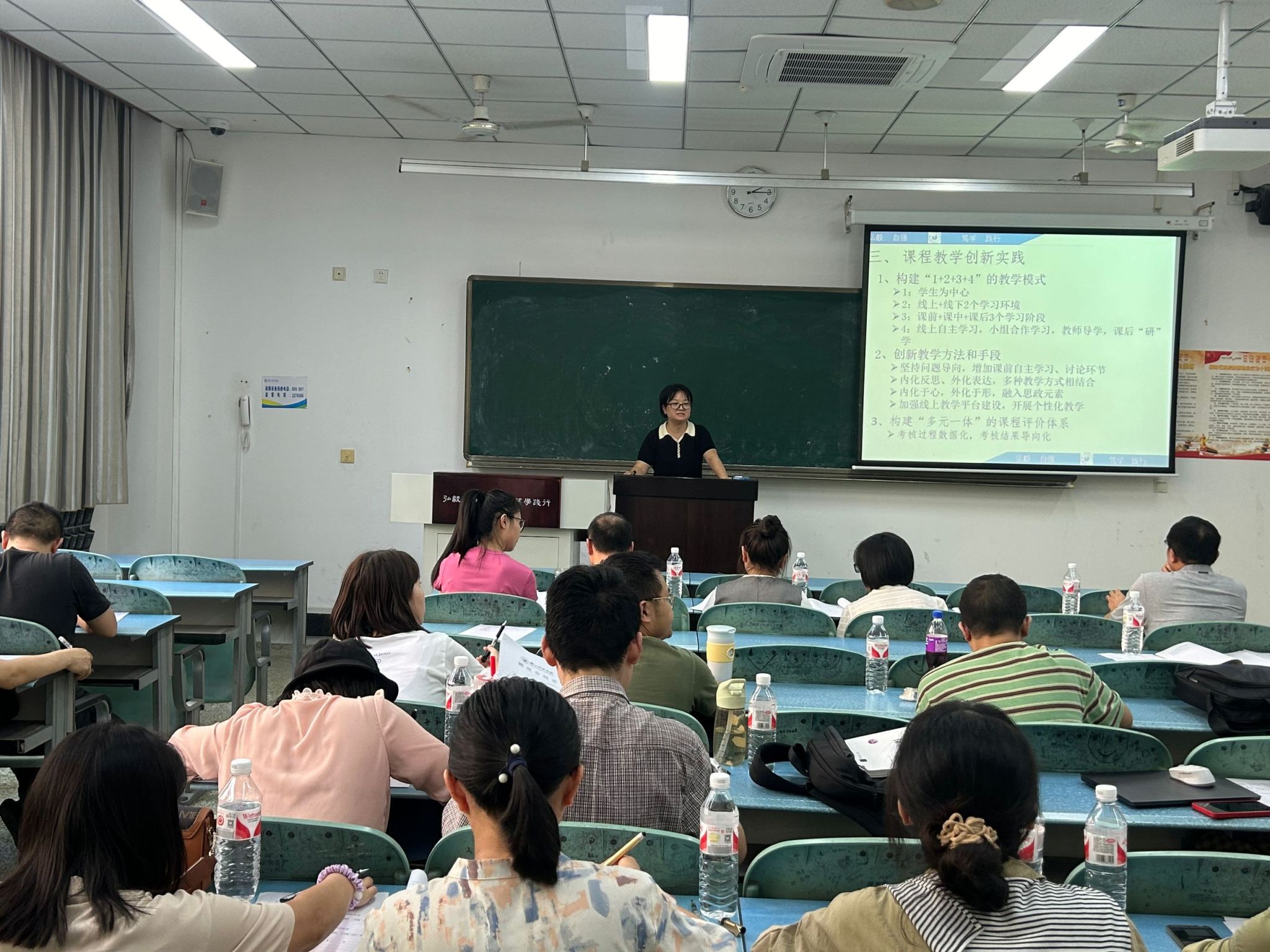 本网讯(文图/樊华娜)9月26日,数理学院在行知楼102教室举办了2024年教学质量奖院内选拔赛。学院全体教职工参加了此次活动,赛事由副院长孙海主持。活动共有9名教师参与教学展示,其中青教赛选手5位,创新赛选手4位。每位参赛选手的展示时间共20分钟,评委由屈小兵、黄宽娜、孙峰、张立、周俊屹担任。